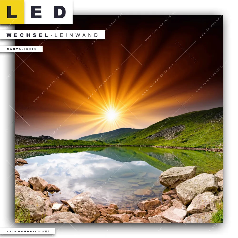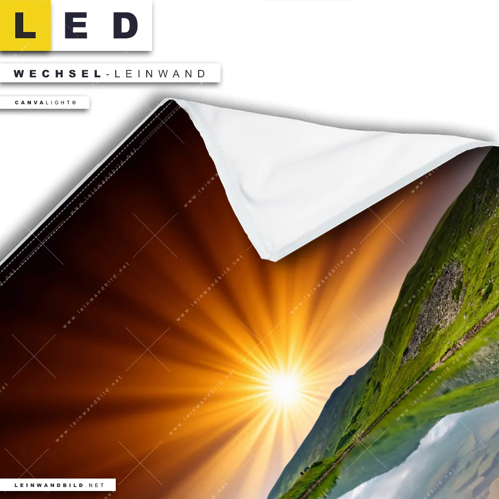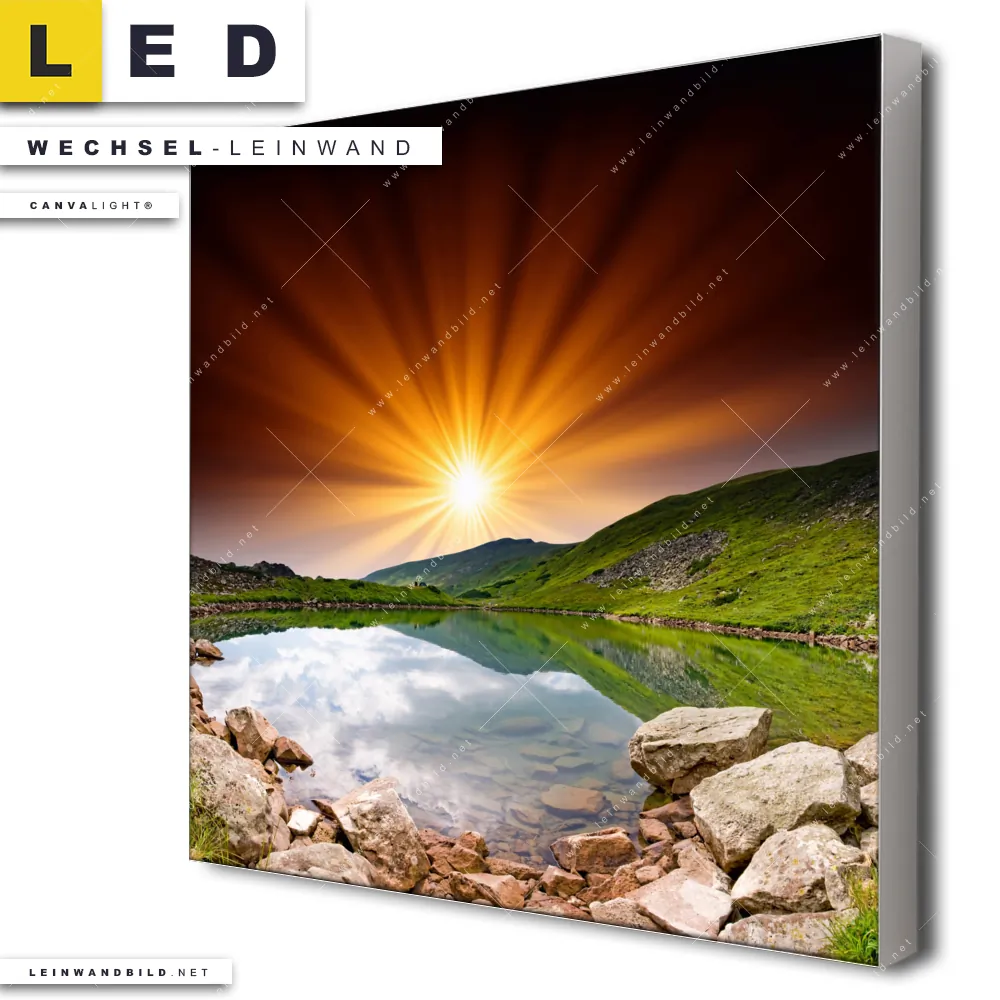 Du bist auf der Suche nach einer Landschaften Wechsel-Leinwand für Dein LED-Leinwandbild im Quadratischen Format? Begriffe wie Landschaft, Natur, Stille, See, Wasser, Berge, Sonnenuntergang, Sonnenaufgang, Sonne, Gebirge haben Dich auf der Suche nach Deiner Ersatz-Leinwand für dein LED Wandbild mit wechselbarer Leinwand inspiriert? Farben wie Orange, Grün dürfen auf Deinem neuen Wechselmotiv für Dein XXL Leinwand-LED-Bild nicht fehlen und Leinwände im Natürlich - Realistisch, Mixed Media Stil für Leuchtbilder passen perfekt zu Deinem Einrichtungsstil?