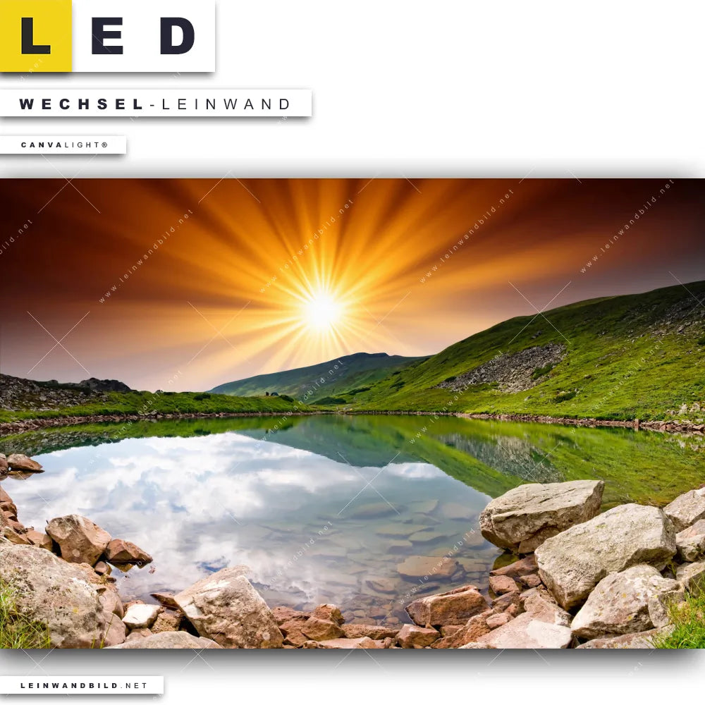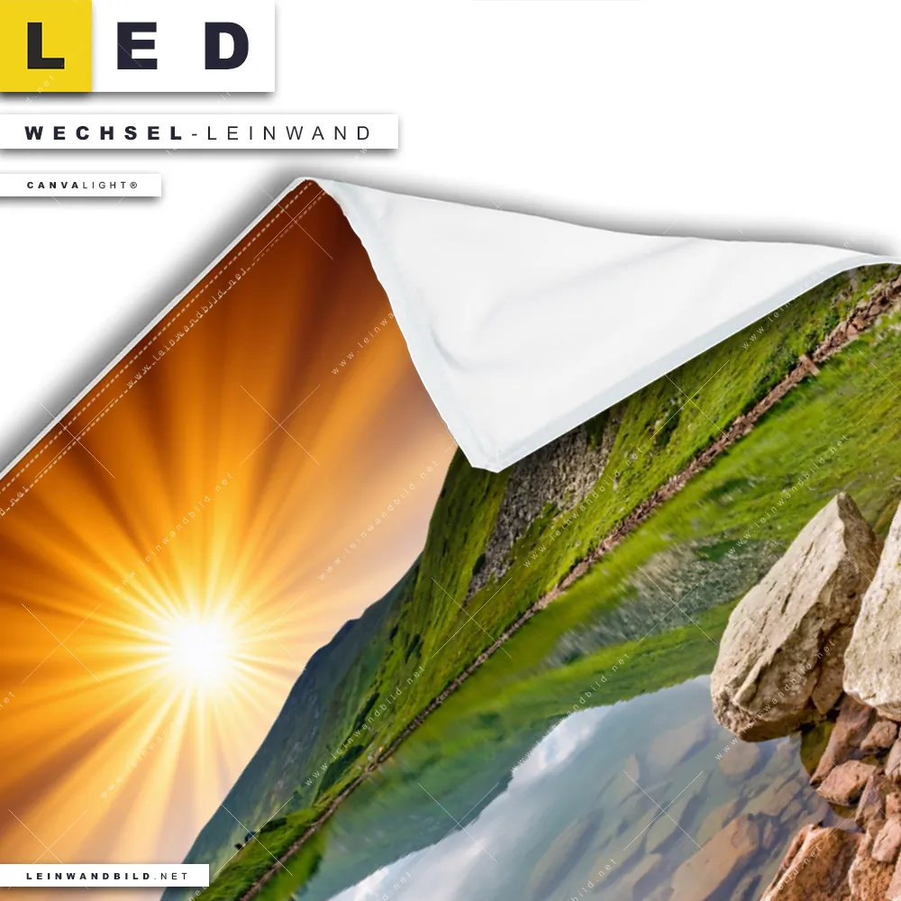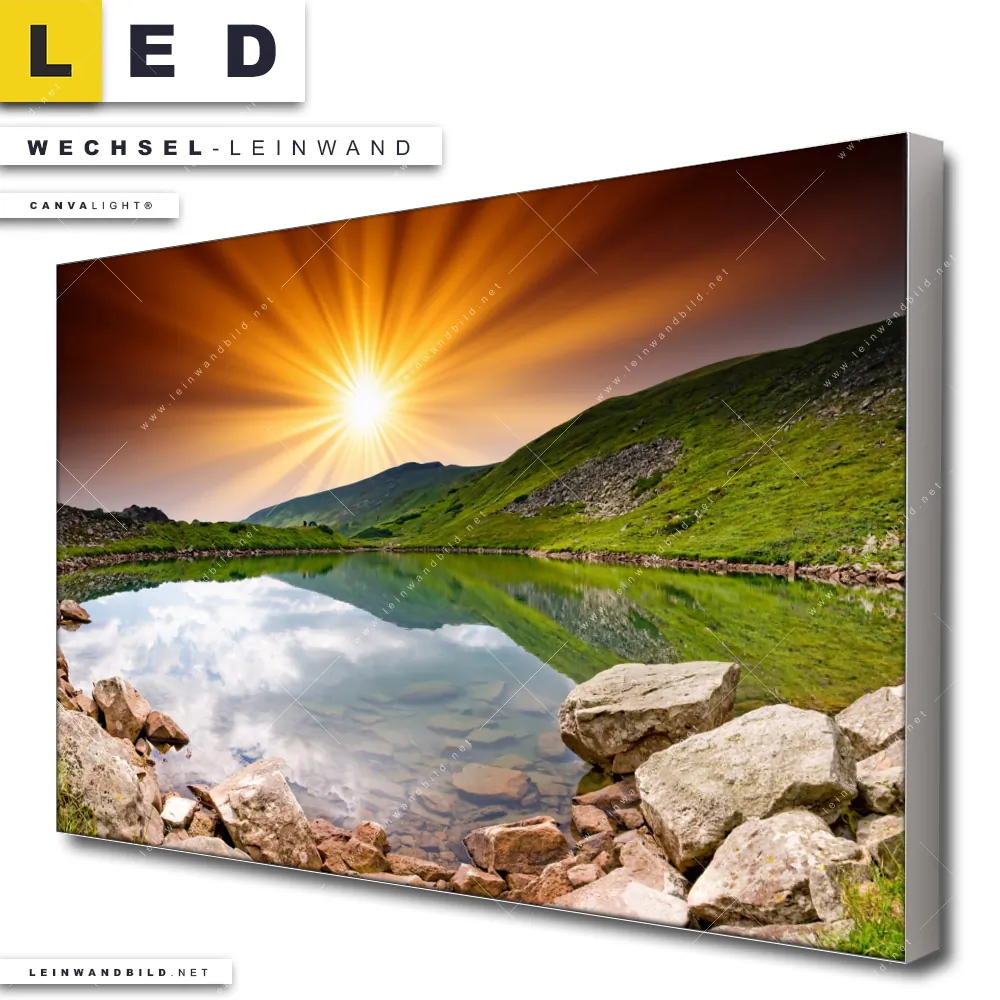 Du bist auf der Suche nach einer Landschaften Wechsel-Leinwand für Dein LED-Leinwandbild im Querformat? Begriffe wie Landschaft, Natur, Stille, See, Wasser, Berge, Sonnenuntergang, Sonnenaufgang, Sonne, Gebirge haben Dich auf der Suche nach Deiner Ersatz-Leinwand für dein breites LED Wandbild mit wechselbarer Leinwand inspiriert? Farben wie Orange, Grün dürfen auf Deinem neuen Wechselmotiv für Dein XXL Leinwand-LED-Bild nicht fehlen und Leinwände im Natürlich - Realistisch, Mixed Media Stil für Leuchtbilder passen perfekt zu Deinem Einrichtungsstil?