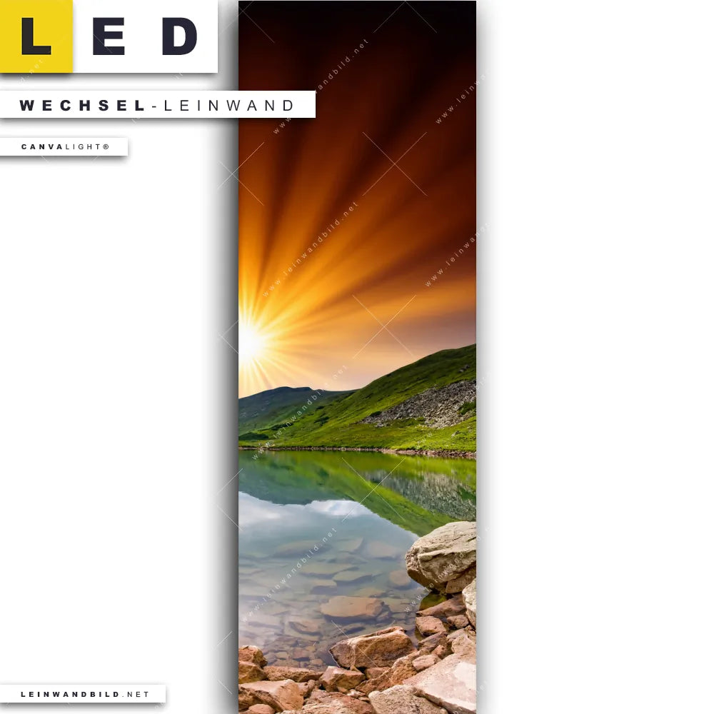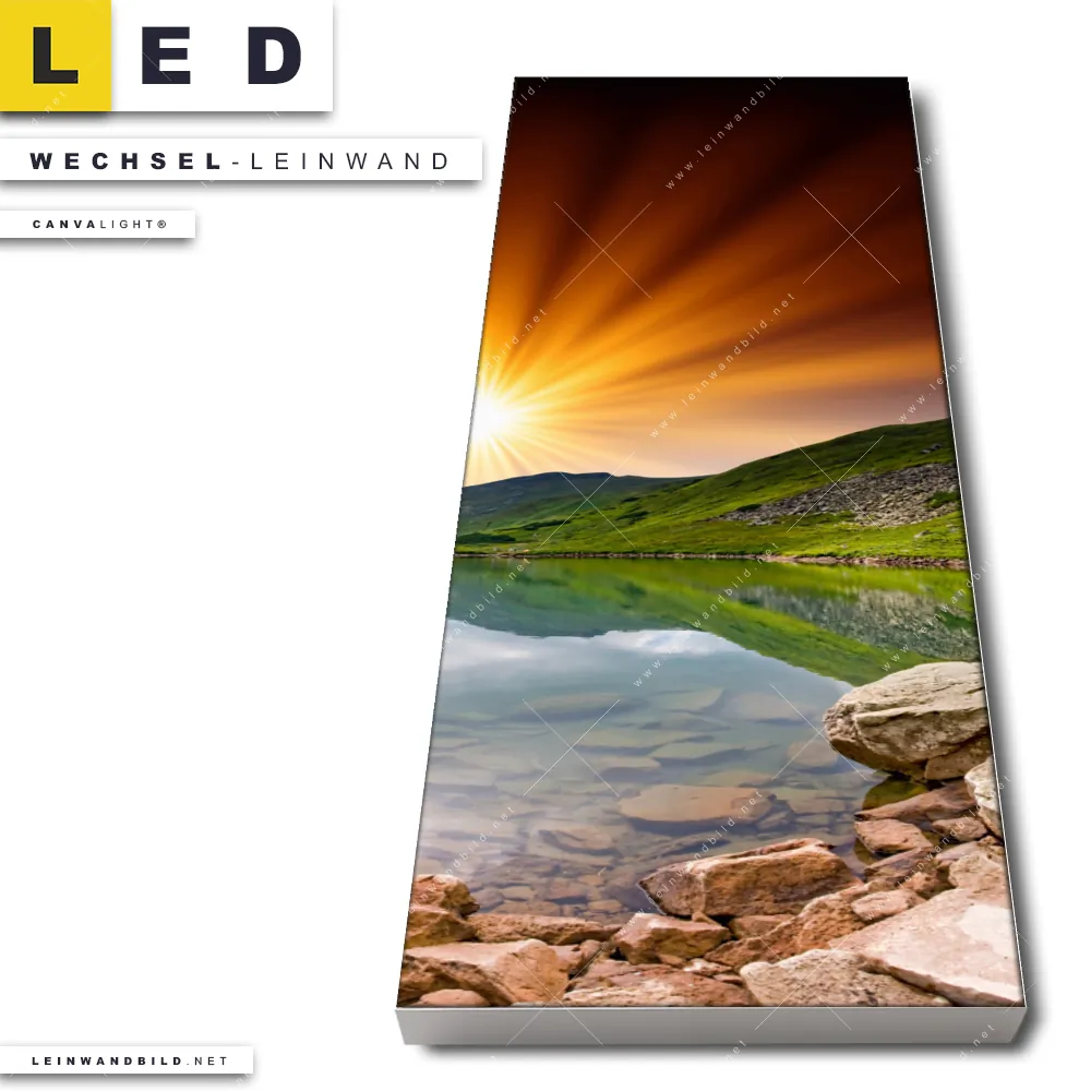 Du bist auf der Suche nach einer Landschaften Wechsel-Leinwand für Dein LED-Leinwandbild im Schmalen Format? Begriffe wie Landschaft, Natur, Stille, See, Wasser, Berge, Sonnenuntergang, Sonnenaufgang, Sonne, Gebirge haben Dich auf der Suche nach Deiner Ersatz-Leinwand für dein LED Wandbild im Panorama-Hochformat mit wechselbarer Leinwand inspiriert? Farben wie Orange, Grün dürfen auf Deinem neuen Wechselmotiv für Dein XXL Leinwand-LED-Bild nicht fehlen und Leinwände im Natürlich - Realistisch, Mixed Media Stil für Leuchtbilder passen perfekt zu Deinem Einrichtungsstil?