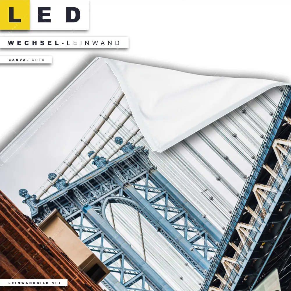 Dann sollte die Wechsel-Leinwand Canvalight® TEX | Manhattan | Quadrat den Weg zu Dir finden. Die Austausch-Leinwand Brücke in Manhatten - passend für unsere stufenlos dimmbaren, steckerfertigen Leinwandbilder im Leuchtrahmen mit Fernbedienung und optionaler Farbtemperatursteuerung - fügt sich als Eye-Catcher harmonisch in jedes Arzt - Praxis, Bar - Gastronomie, Büro - Kanzlei, Wohnzimmer - Schlafzimmer Raumkonzept ein.