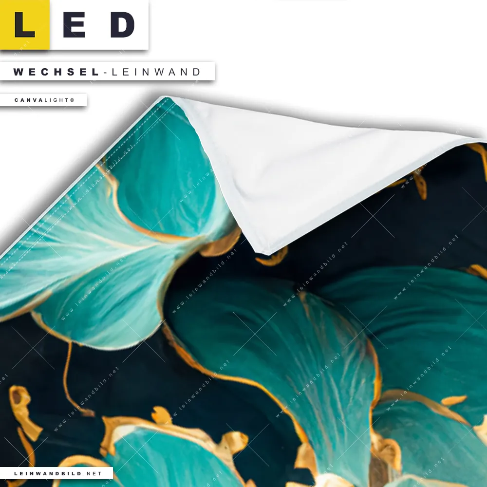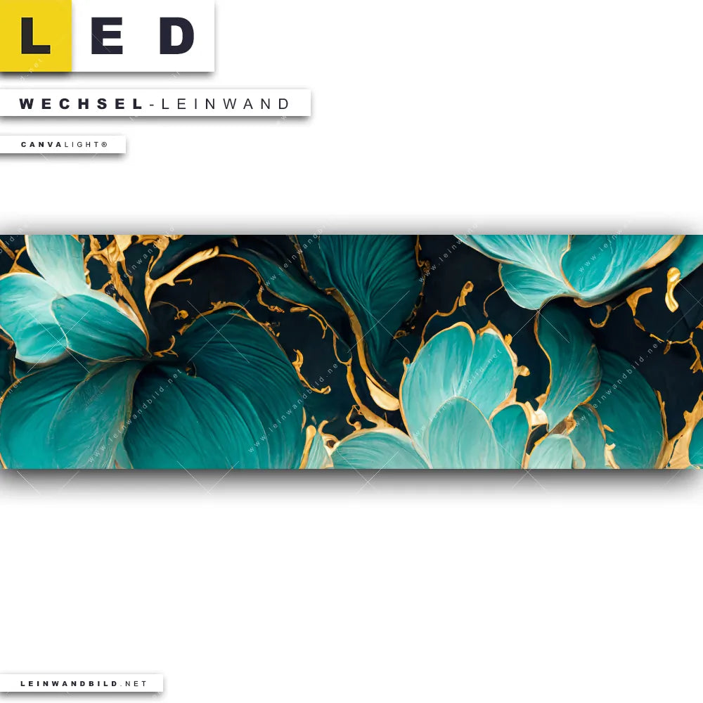 LED Wechsel-Leinwand Canvalight® TEX | Marmor Blüten in türkis & gold | Panorama