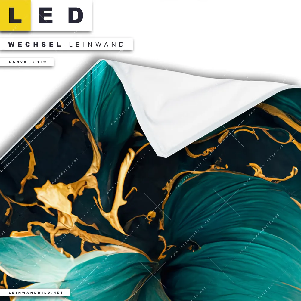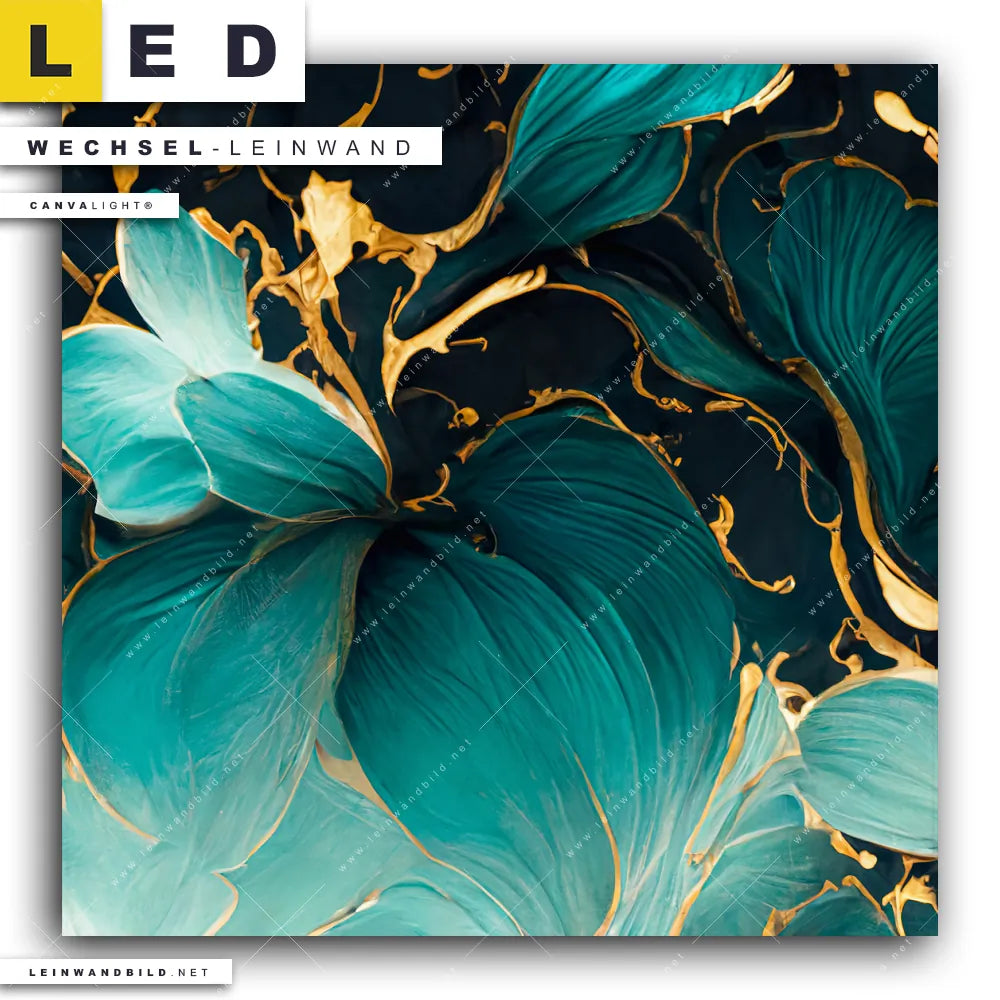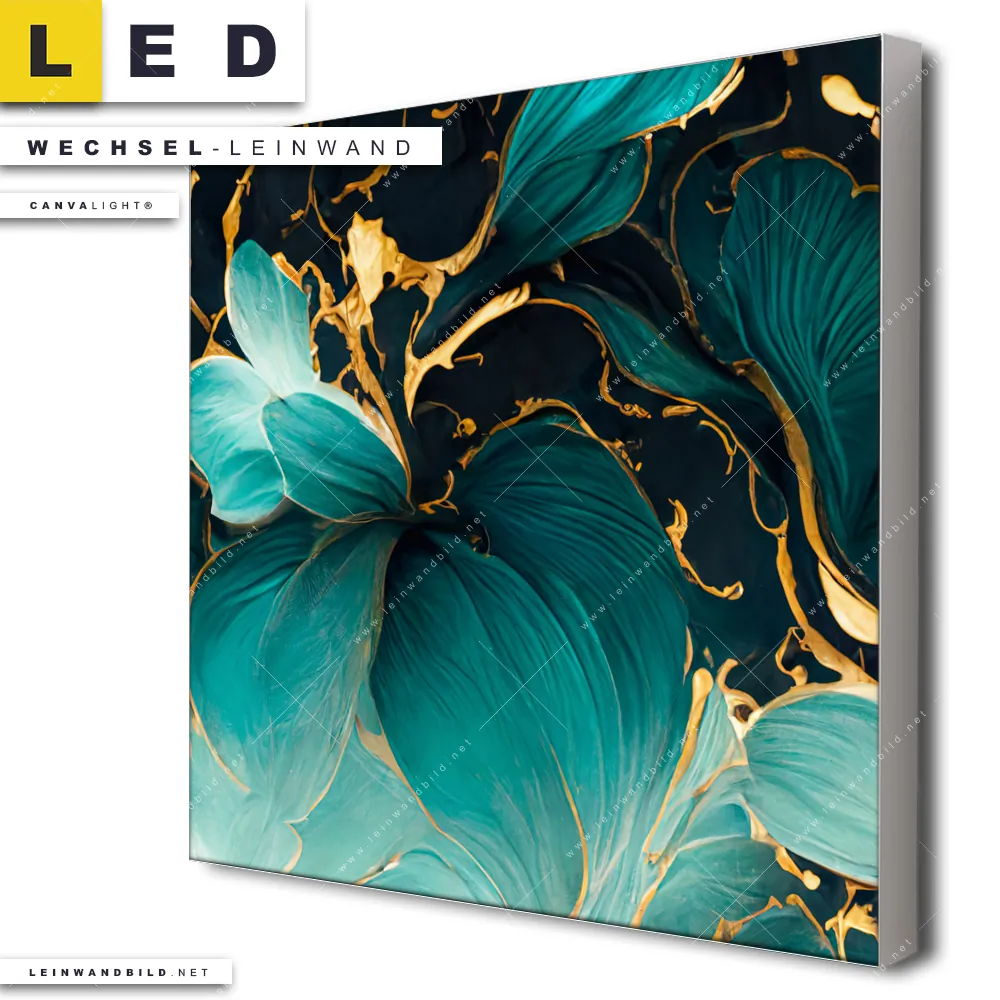 Du konfigurierst Deine individuelle LED Wechsel-Leinwand Canvalight® TEX | Marmor Blüten in türkis & gold | Quadrat und wir produzieren sie NEU für Dich. Unsere Muster - Texturen, Blumen - Botanik Austausch-Fotoleinwände für Canvalight® LED Bilder sind KEINE Lagerware. Du bist Dir unsicher, welches Motiv oder Format das richtige für dein individuelles LED Wechselmotiv auf Leinwand ist, dann helfen wir dir gerne weiter und beraten dich!