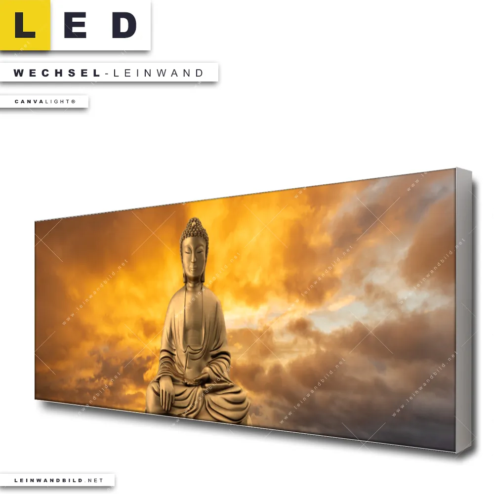 Du bist auf der Suche nach einer Buddha - Feng Shui Wechsel-Leinwand für Dein LED-Leinwandbild im Panorama-Format? Begriffe wie Buddha, Buddhismus, Religion, Feng Shui, Zen, Meditation, Licht, Erleuchtung, Sonnenlicht, Sonnenuntergang, Spiegelung, Skulptur haben Dich auf der Suche nach Deiner Ersatz-Leinwand für dein extra breites LED Wandbild mit wechselbarer Leinwand inspiriert? Farben wie Gold, Orange, Beige dürfen auf Deinem neuen Wechselmotiv für Dein XXL Leinwand-LED-Bild nicht fehlen und Leinwände im Modern Art Stil für Leuchtbilder passen perfekt zu Deinem Einrichtungsstil?