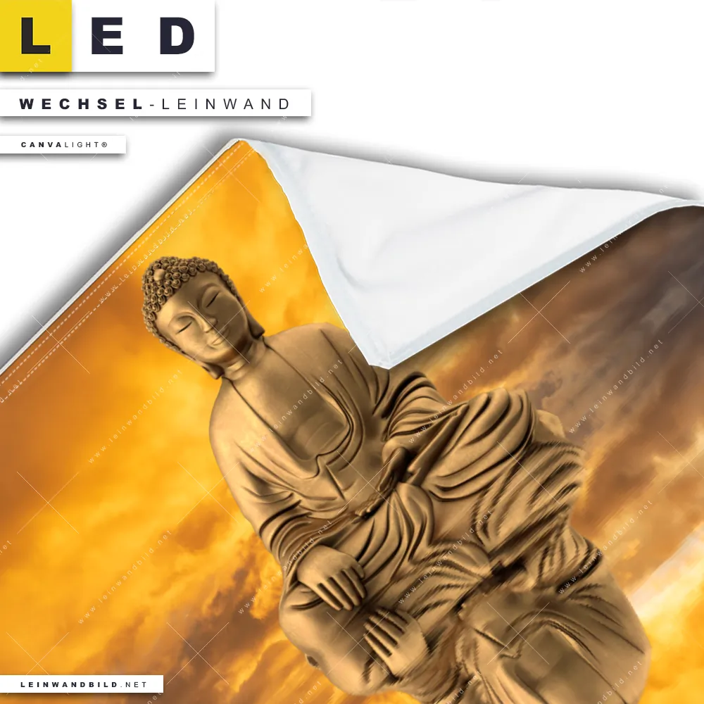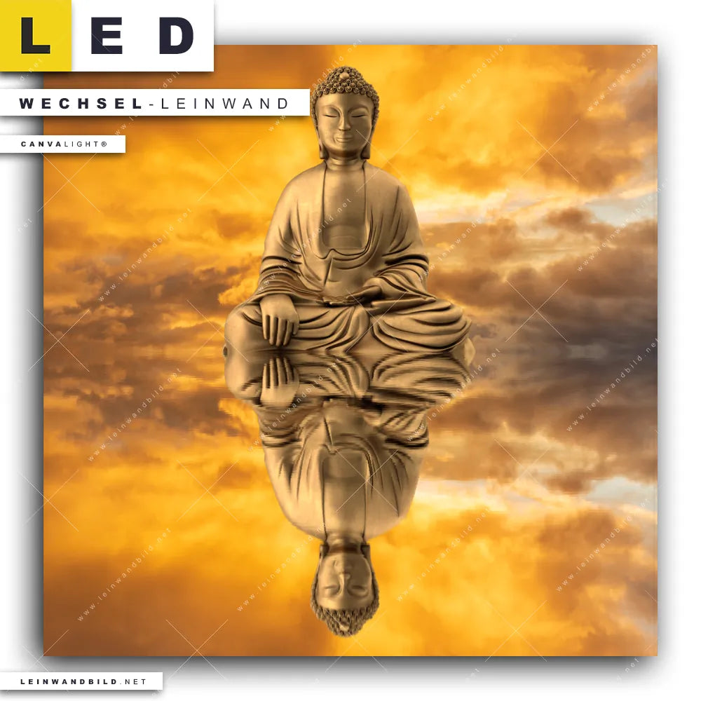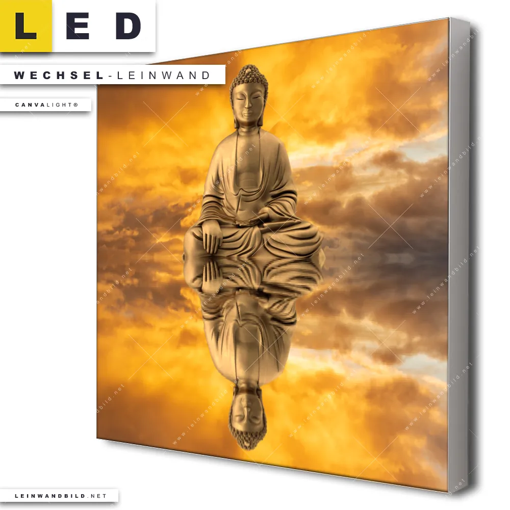Du bist auf der Suche nach einer Buddha - Feng Shui Wechsel-Leinwand für Dein LED-Leinwandbild im Quadratischen Format? Begriffe wie Buddha, Buddhismus, Religion, Feng Shui, Zen, Meditation, Licht, Erleuchtung, Sonnenlicht, Sonnenuntergang, Spiegelung, Skulptur haben Dich auf der Suche nach Deiner Ersatz-Leinwand für dein LED Wandbild mit wechselbarer Leinwand inspiriert? Farben wie Gold, Orange, Beige dürfen auf Deinem neuen Wechselmotiv für Dein XXL Leinwand-LED-Bild nicht fehlen und Leinwände im Modern Art Stil für Leuchtbilder passen perfekt zu Deinem Einrichtungsstil?