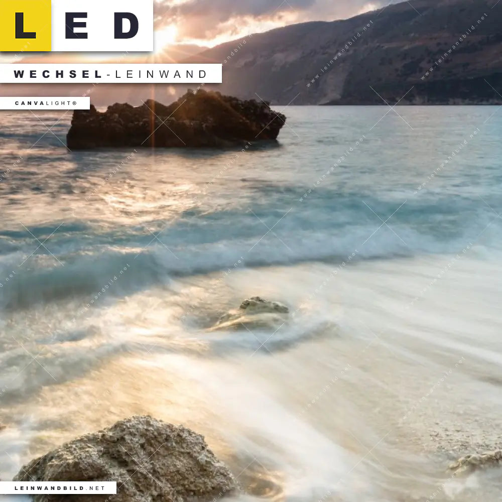 Auf der Suche nach Deinem neuen Wechselmotiv für LED Bilder mit austauschbarer Textil-Leinwand haben Dich Begriffe wie Sommer, Ostsee, Nordsee, Sonnenuntergang, Sonnenaufgang, Natur, Urlaub, Reisen, Meer, Strand, Insel, Steine, Felsen inspiriert? Dann sollte die Wechsel-Leinwand Wellen und Felsen im Abendlicht für Canvalight® TEX LED Leuchtbilder den Weg zu Dir finden.