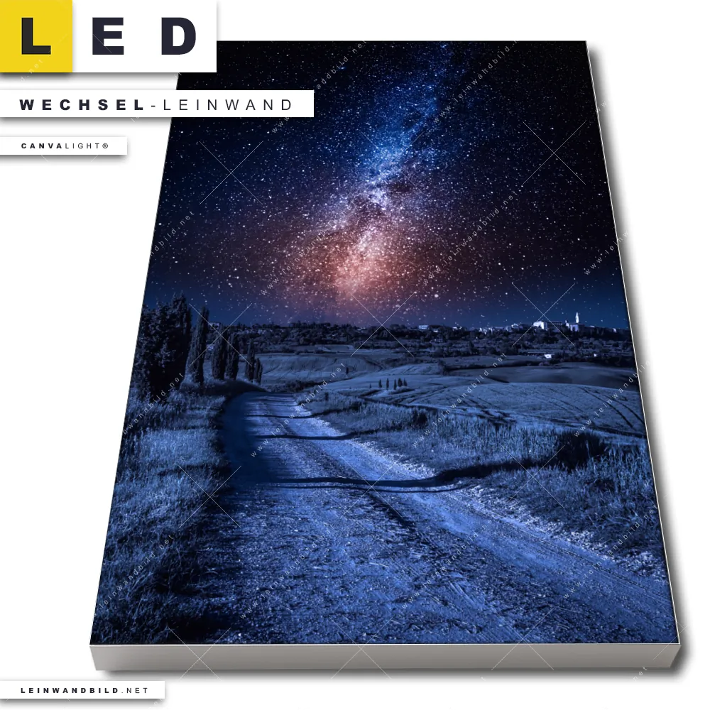 LED Wechsel-Leinwand Canvalight® TEX | Milchstraße über einem Feldweg | Hochformat