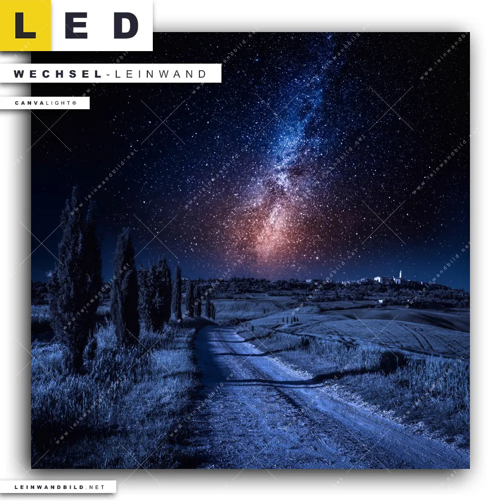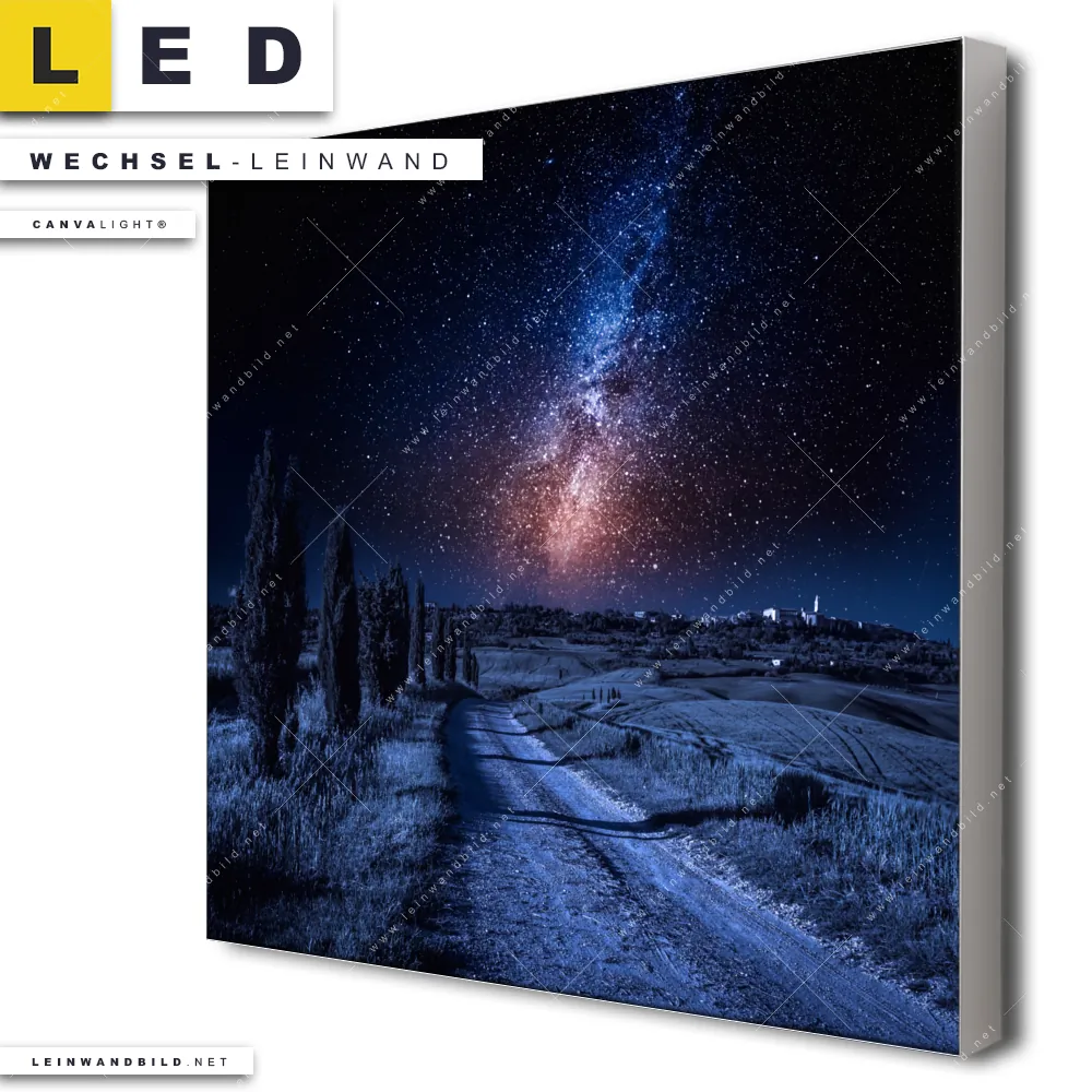 Du bist auf der Suche nach einer Landschaften Wechsel-Leinwand für Dein LED-Leinwandbild im Quadratischen Format? Begriffe wie Horizont, Reisen, Steg, Sternenhimmel, Milchstraße, Nacht, Weltall, Nachthimmel, Sterne, Dorf, Nachtlandschaft, Schotterweg, Felder, Wandern bei Nacht, Landschaft haben Dich auf der Suche nach Deiner Ersatz-Leinwand für dein LED Wandbild mit wechselbarer Leinwand inspiriert? Farben wie Weiss, Schwarz, Blau, Braun, Ocker, Hellblau dürfen auf Deinem neuen Wechselmotiv für Dein XXL Leinwand-LED-Bild nicht fehlen und Leinwände im Natürlich - Realistisch Stil für Leuchtbilder passen perfekt zu Deinem Einrichtungsstil?