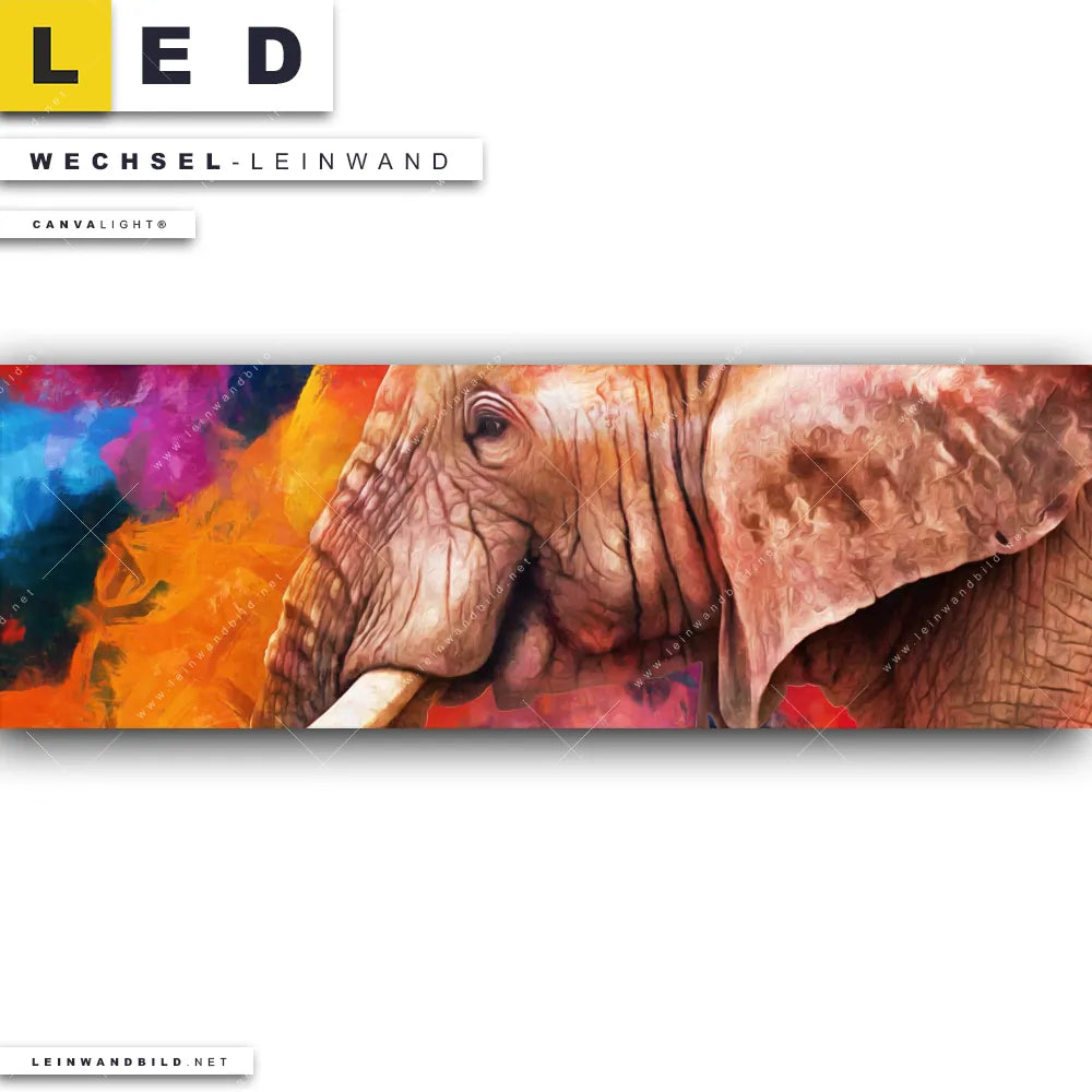 Dann sollte die Wechsel-Leinwand Canvalight® TEX | Moderner Bunter Elefant | Panorama den Weg zu Dir finden. Die Austausch-Leinwand prächtiger Elefant - passend für unsere stufenlos dimmbaren, steckerfertigen Leinwandbilder im LED Leuchtrahmen mit Fernbedienung und optionaler Farbtemperatursteuerung - fügt sich als Eye-Catcher harmonisch in jedes Arzt - Praxis, Büro - Kanzlei, Wohnzimmer - Schlafzimmer, Bar - Gastronomie, Friseur - Beauty Raumkonzept ein.