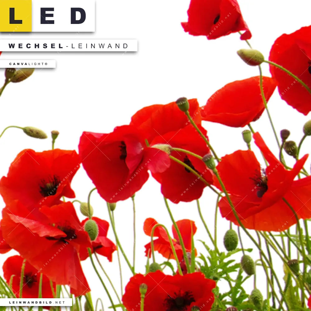 Du bist auf der Suche nach einer Landschaften, Blumen - Botanik Wechsel-Leinwand für Dein LED-Leinwandbild im Quadratischen Format? Begriffe wie Blume, Botanik, Pflanze, Natur, Mohn, Mohnblume, Wiese haben Dich auf der Suche nach Deiner Ersatz-Leinwand für dein LED Wandbild mit wechselbarer Leinwand inspiriert? Farben wie Rot, Grün, Weiss dürfen auf Deinem neuen Wechselmotiv für Dein XXL Leinwand-LED-Bild nicht fehlen und Leinwände im Natürlich - Realistisch Stil für Leuchtbilder passen perfekt zu Deinem Einrichtungsstil?