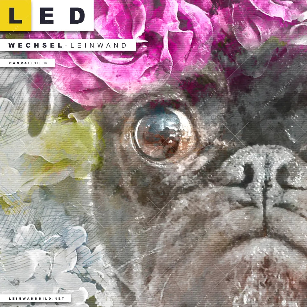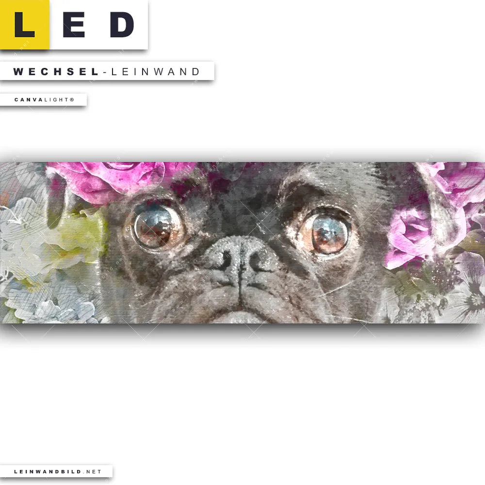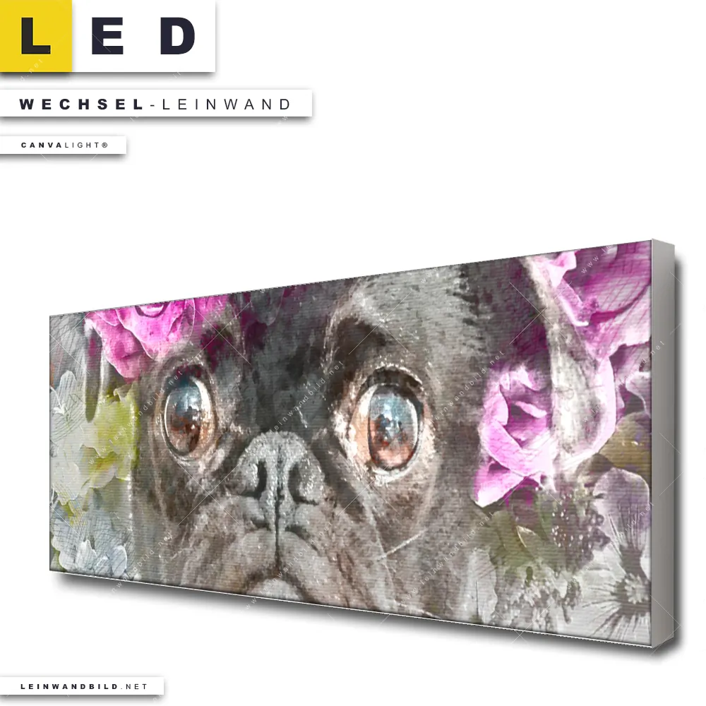 Du bist auf der Suche nach einer Tierwelt, Blumen - Botanik Wechsel-Leinwand für Dein LED-Leinwandbild im Panorama-Format? Begriffe wie Tiere & Blumen, Mops, Hund, Tier, Blumen, Blüten haben Dich auf der Suche nach Deiner Ersatz-Leinwand für dein extra breites LED Wandbild mit wechselbarer Leinwand inspiriert? Farben wie Schwarz, Pink, Weiss, Blau, Gelb , Grau , Braun, Ocker dürfen auf Deinem neuen Wechselmotiv für Dein XXL Leinwand-LED-Bild nicht fehlen und Leinwände im Abstrakt, Grunge, Mixed Media, Modern Art, Floral Stil für Leuchtbilder passen perfekt zu Deinem Einrichtungsstil?
