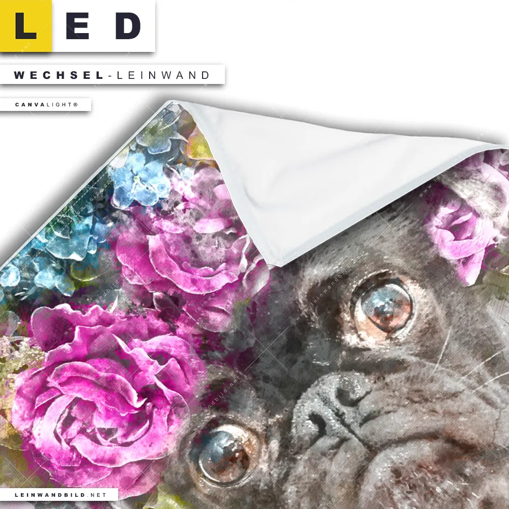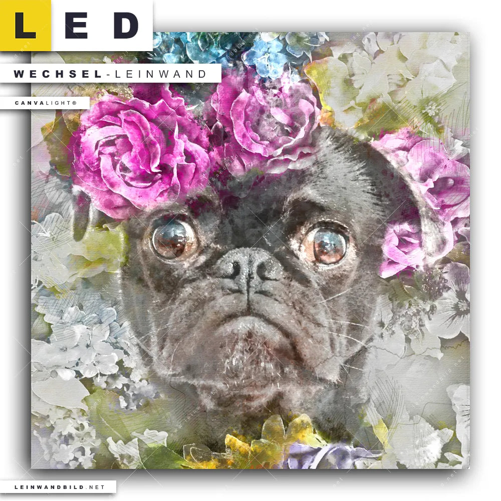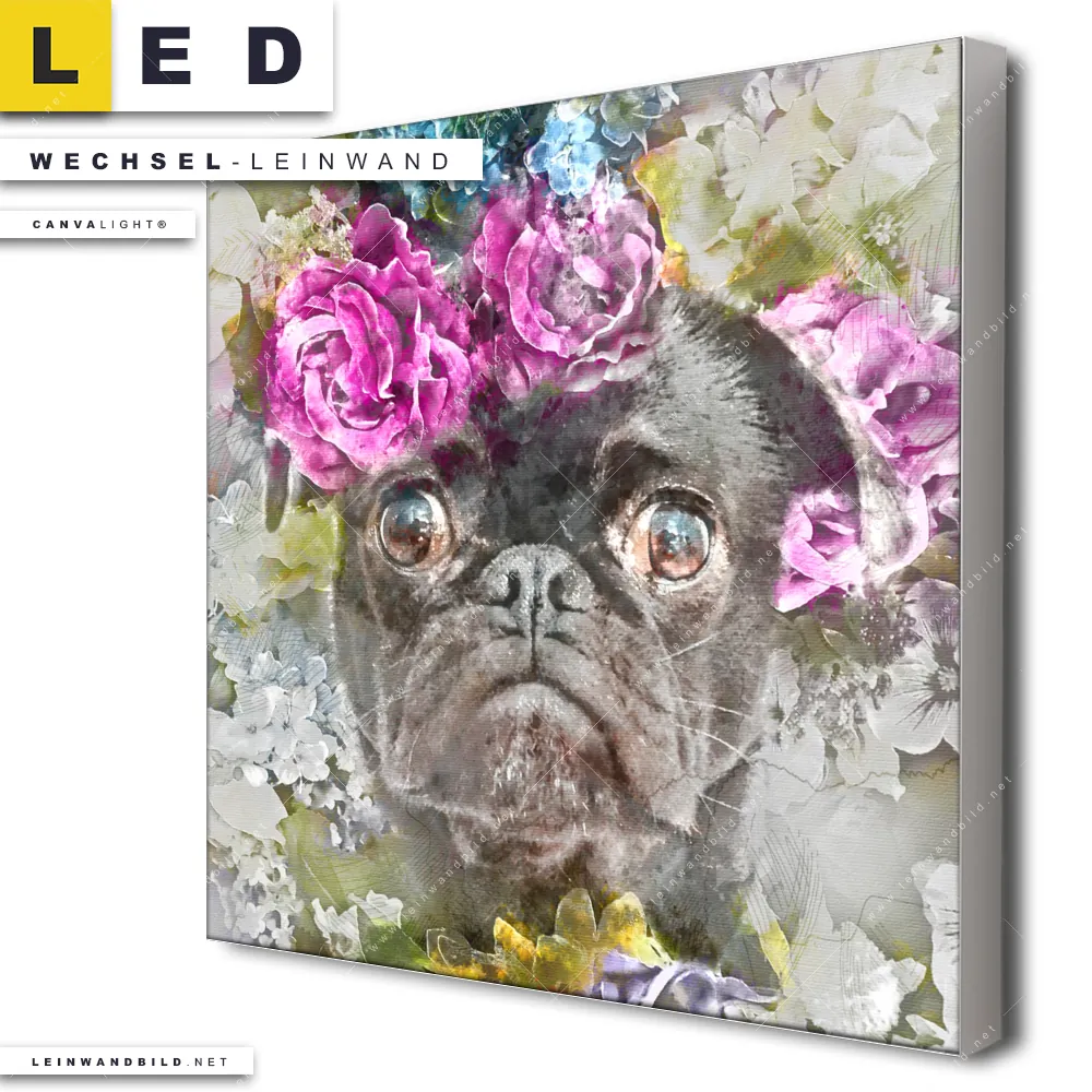 Du bist auf der Suche nach einer Tierwelt, Blumen - Botanik Wechsel-Leinwand für Dein LED-Leinwandbild im Quadratischen Format? Begriffe wie Tiere & Blumen, Mops, Hund, Tier, Blumen, Blüten haben Dich auf der Suche nach Deiner Ersatz-Leinwand für dein LED Wandbild mit wechselbarer Leinwand inspiriert? Farben wie Schwarz, Pink, Weiss, Blau, Gelb , Grau , Braun, Ocker dürfen auf Deinem neuen Wechselmotiv für Dein XXL Leinwand-LED-Bild nicht fehlen und Leinwände im Abstrakt, Grunge, Mixed Media, Modern Art, Floral Stil für Leuchtbilder passen perfekt zu Deinem Einrichtungsstil?