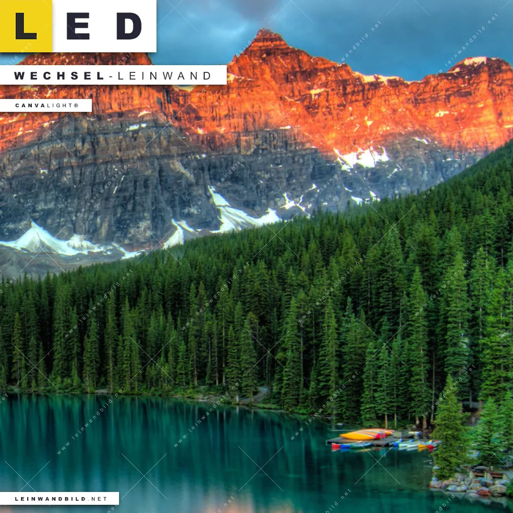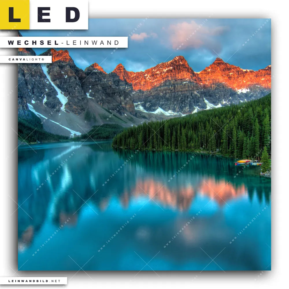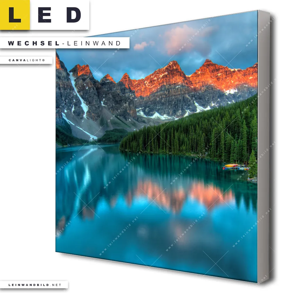 Dann sollte die Wechsel-Leinwand Canvalight® TEX | Moränensee Sonnenaufgang | Quadrat den Weg zu Dir finden. Die Austausch-Leinwand Glühende Berggipfel am stillen See - passend für unsere stufenlos dimmbaren, steckerfertigen Leinwandbilder im Leuchtrahmen mit Fernbedienung und optionaler Farbtemperatursteuerung - fügt sich als Eye-Catcher harmonisch in jedes Arzt - Praxis, Bar - Gastronomie, Büro - Kanzlei, Flur - Eingangsbereich, Wohnzimmer - Schlafzimmer Raumkonzept ein.