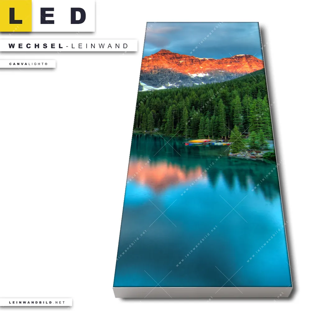 Du konfigurierst Deine individuelle LED Wechsel-Leinwand Canvalight® TEX | Moränensee Sonnenaufgang | Schmal und wir produzieren sie NEU für Dich. Unsere Landschaften Austausch-Fotoleinwände für Canvalight® LED Bilder sind KEINE Lagerware. Du bist Dir unsicher, welches Motiv oder Format das richtige für dein individuelles LED Wechselmotiv auf Leinwand ist, dann helfen wir dir gerne weiter und beraten dich!