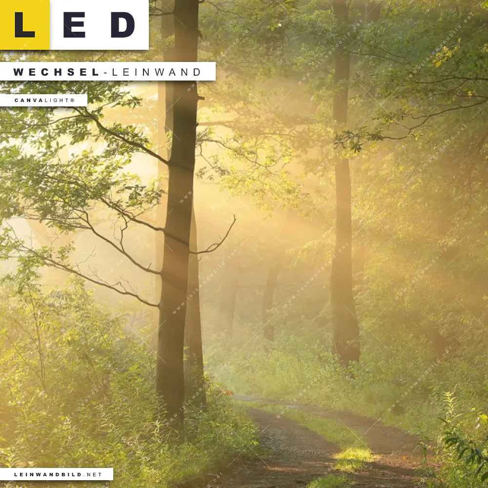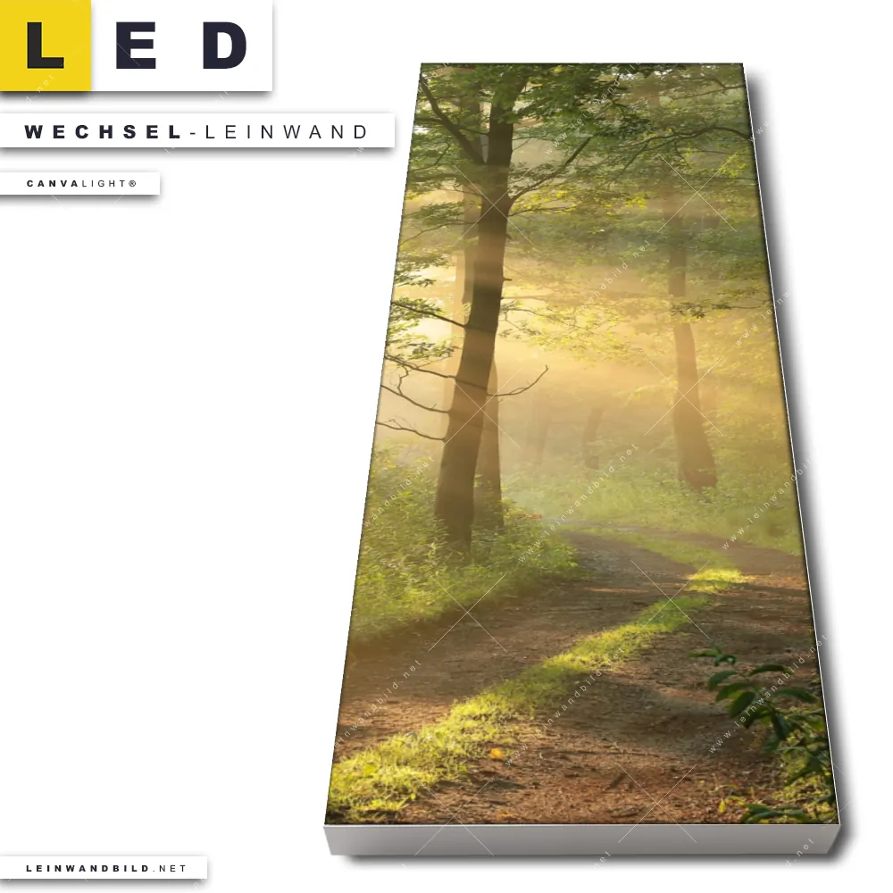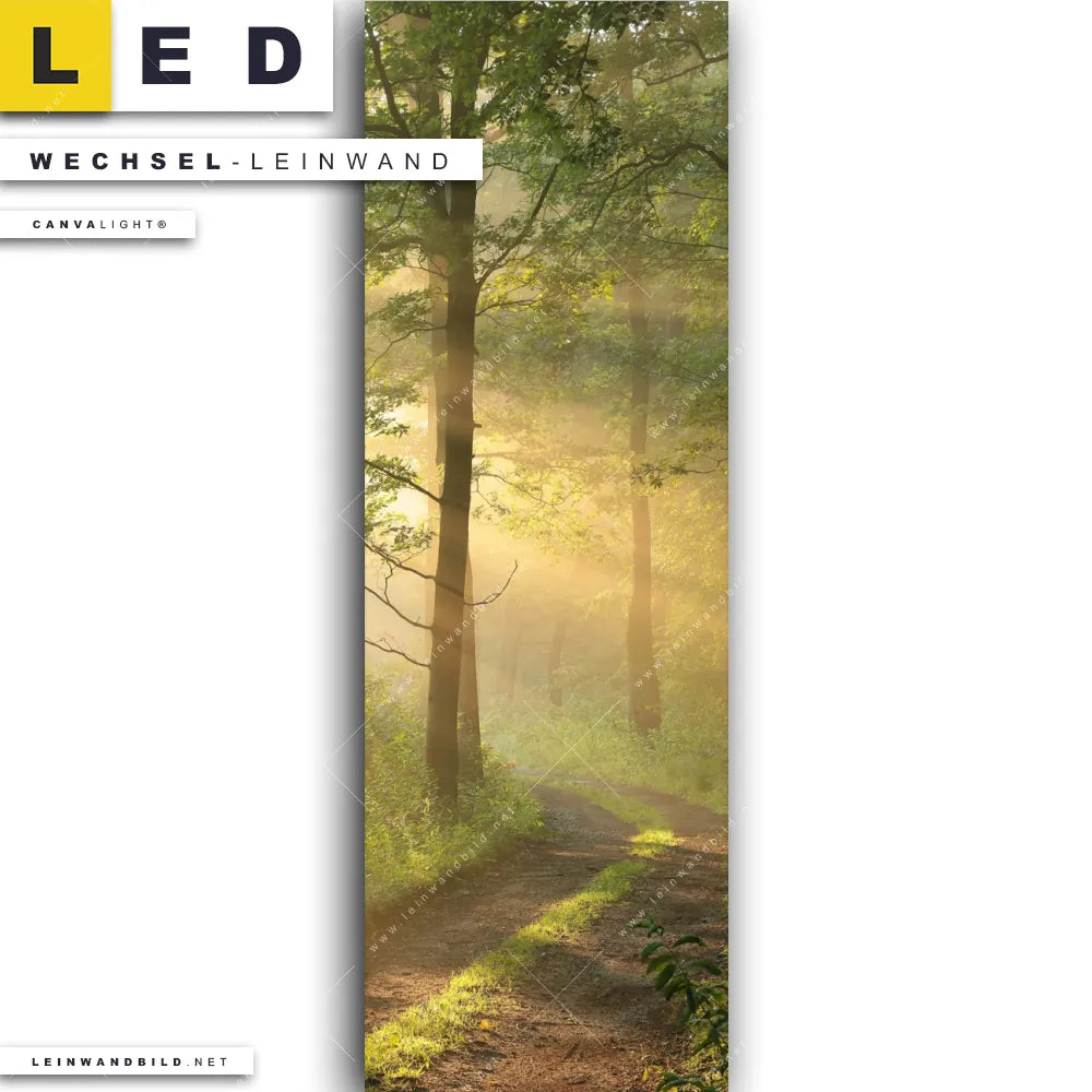 LED Wechsel-Leinwand Canvalight® TEX | Morgenspaziergang im nebeligem Wald | Schmal