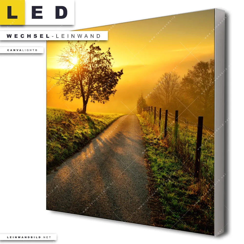 Du konfigurierst Deine individuelle LED Wechsel-Leinwand Canvalight® TEX | Morgenspaziergang | Quadrat und wir produzieren sie NEU für Dich. Unsere Landschaften Austausch-Fotoleinwände für Canvalight® LED Bilder sind KEINE Lagerware. Du bist Dir unsicher, welches Motiv oder Format das richtige für dein individuelles LED Wechselmotiv auf Leinwand ist, dann helfen wir dir gerne weiter und beraten dich!