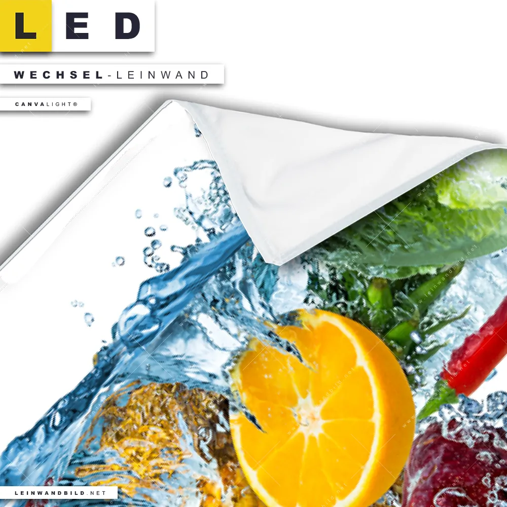 Bitte beachte, dass die Farben, der auf dem Monitor abgebildeten Obst & Gemüse mit Wasserspritzern Darstellung, möglicherweise von den Originalfarben deiner Canvalight® TEX Wechsel-Leinwand abweichen können.