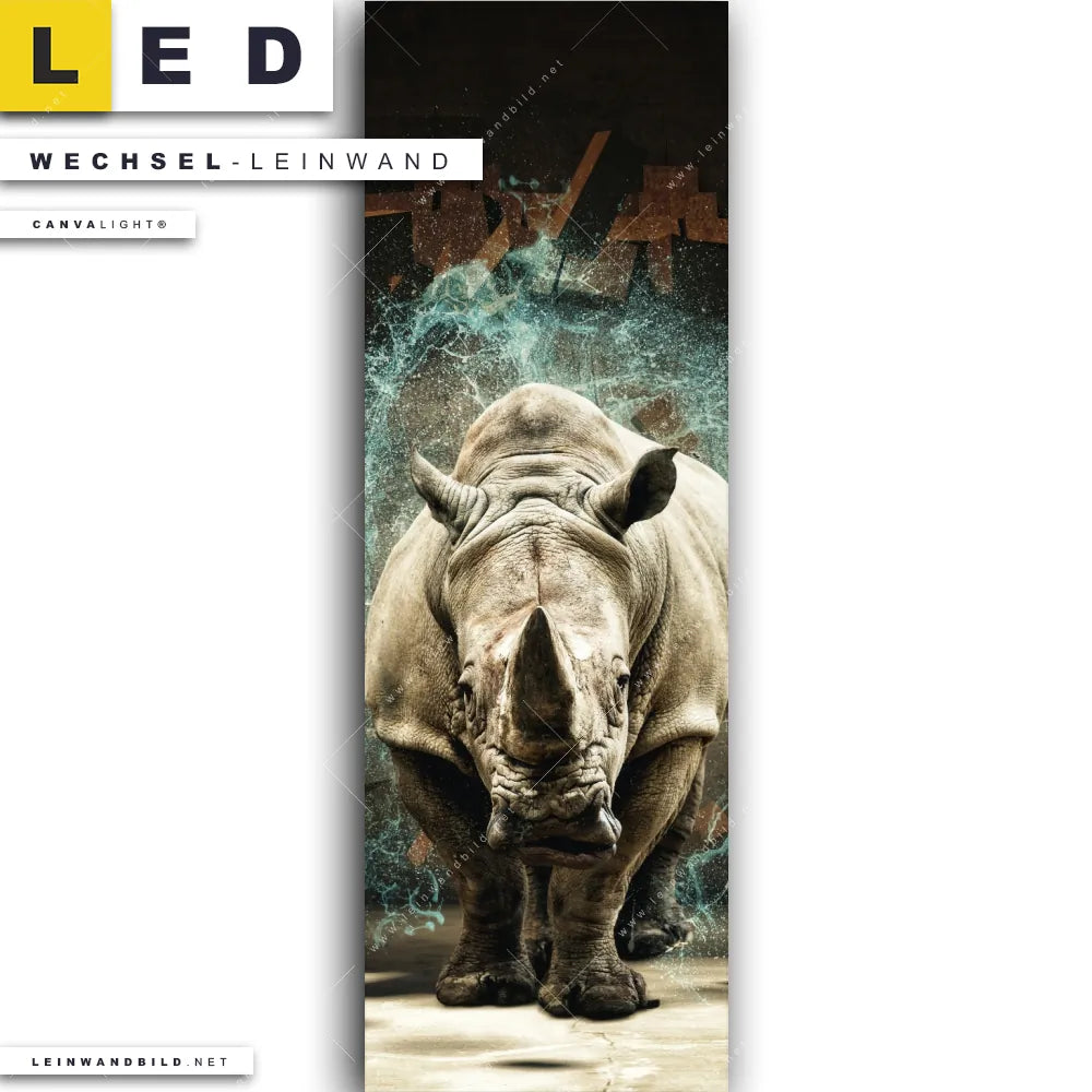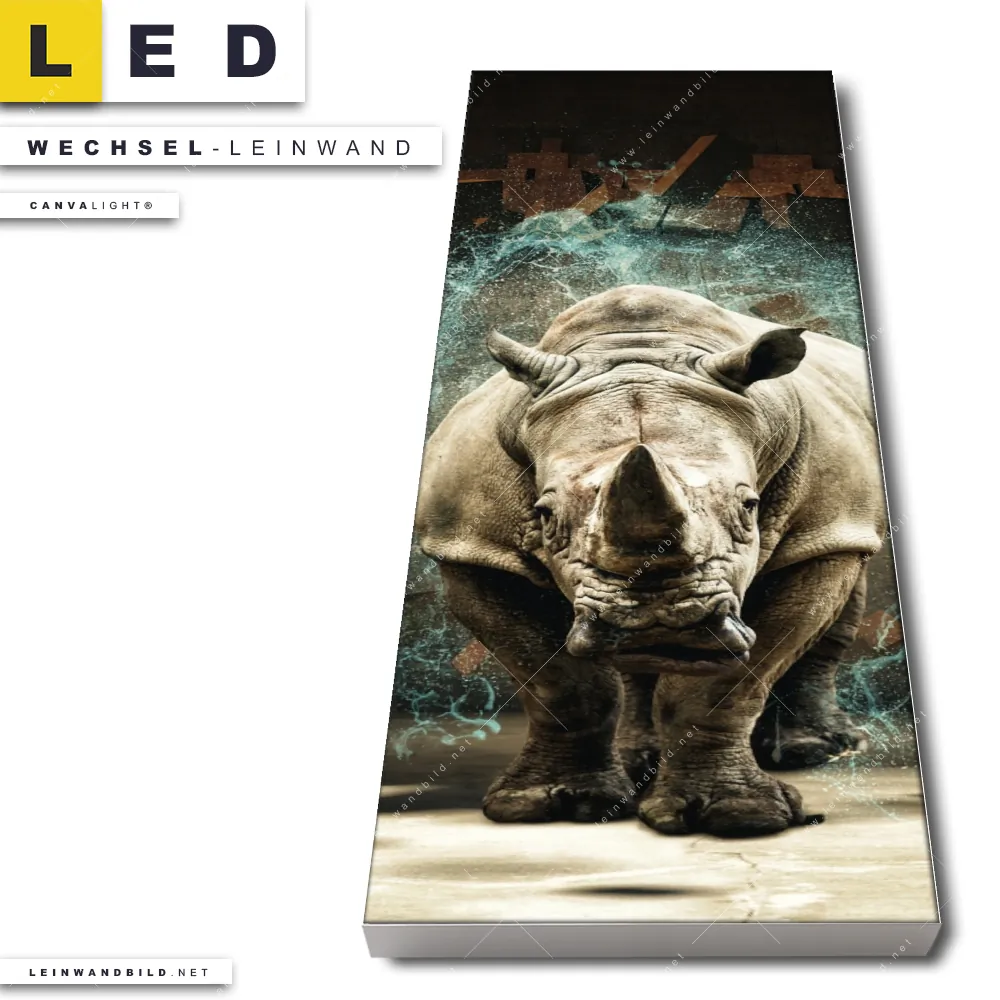 Du bist auf der Suche nach einer Tierwelt Wechsel-Leinwand für Dein LED-Leinwandbild im Schmalen Format? Begriffe wie Nashorn, Afrika, wild, Safari, Mauer, Durchbruch, Zerstörung haben Dich auf der Suche nach Deiner Ersatz-Leinwand für dein LED Wandbild im Panorama-Hochformat mit wechselbarer Leinwand inspiriert? Farben wie Beige, Türkis, Schwarz dürfen auf Deinem neuen Wechselmotiv für Dein XXL Leinwand-LED-Bild nicht fehlen und Leinwände im Modern Art, Mixed Media Stil für Leuchtbilder passen perfekt zu Deinem Einrichtungsstil?