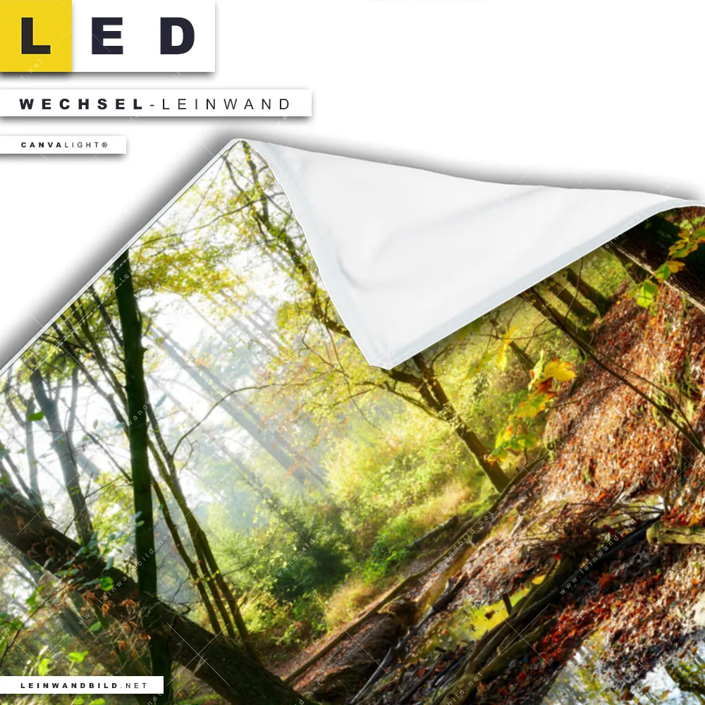 Bitte beachte, dass die Farben, der auf dem Monitor abgebildeten Herbstlicher Wald mit Bach Darstellung, möglicherweise von den Originalfarben deiner Canvalight® TEX Wechsel-Leinwand abweichen können.