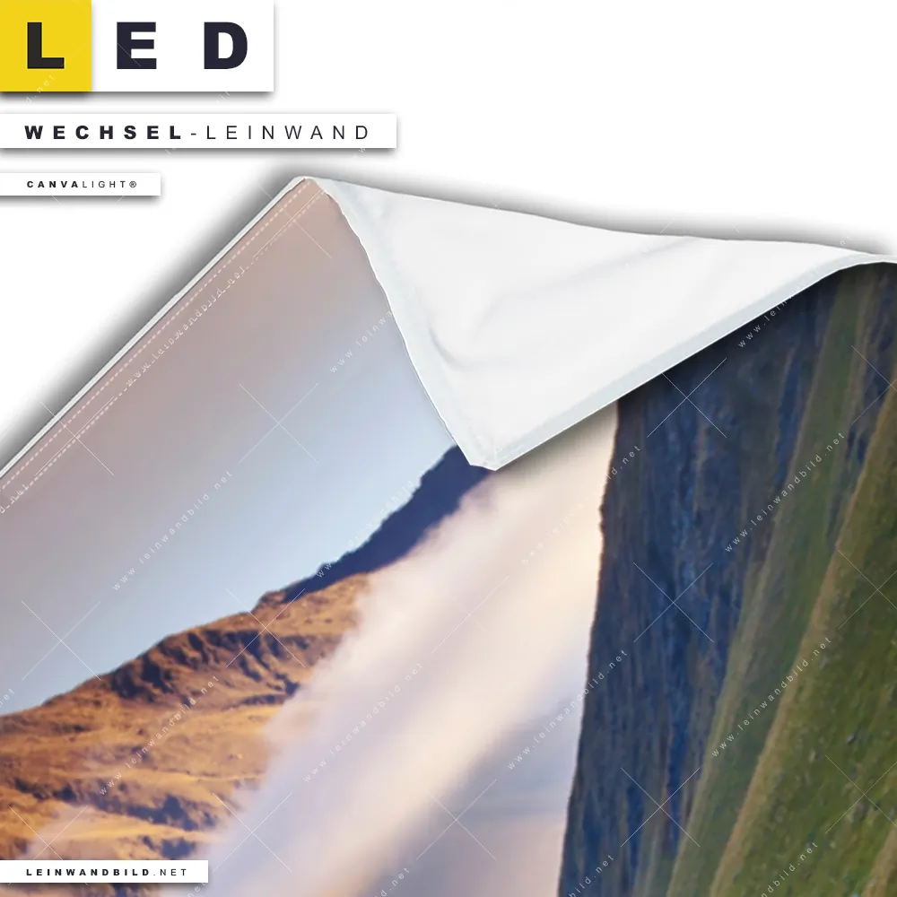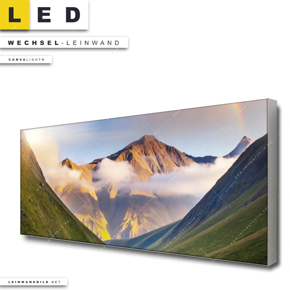LED Wechsel-Leinwand Canvalight® TEX | Nebel und Regenbogen zwischen den Bergen | Panorama