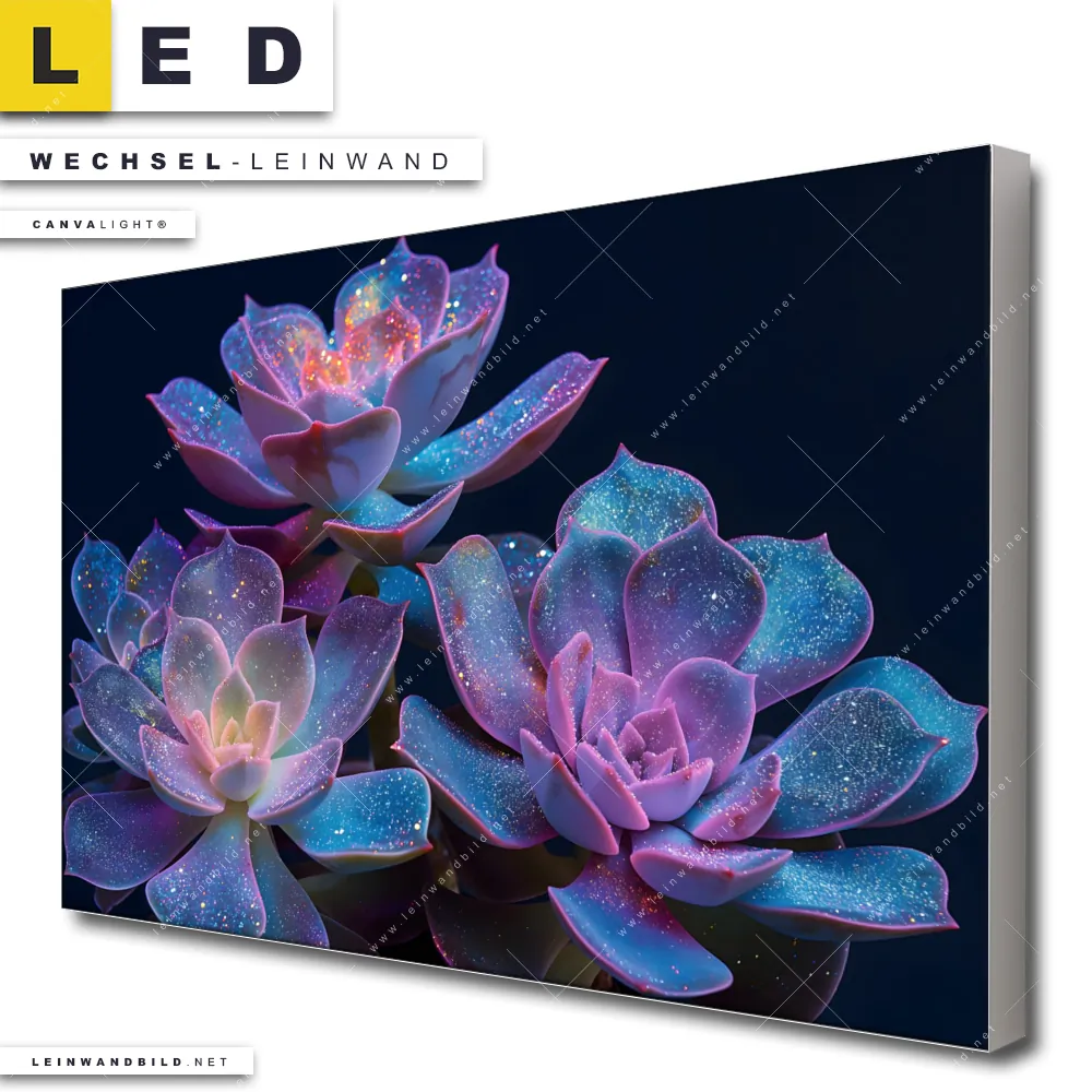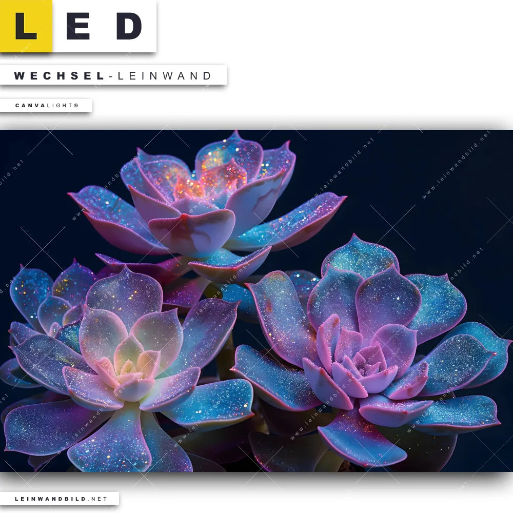 Du bist auf der Suche nach einer Blumen - Botanik Wechsel-Leinwand für Dein LED-Leinwandbild im Querformat? Begriffe wie Blumen, Sukkulente, Kaktus, Pflanze, Natur, Blüten, Glitzer haben Dich auf der Suche nach Deiner Ersatz-Leinwand für dein breites LED Wandbild mit wechselbarer Leinwand inspiriert? Farben wie Lila, Schwarz, Blau dürfen auf Deinem neuen Wechselmotiv für Dein XXL Leinwand-LED-Bild nicht fehlen und Leinwände im Floral, Modern Art Stil für Leuchtbilder passen perfekt zu Deinem Einrichtungsstil?