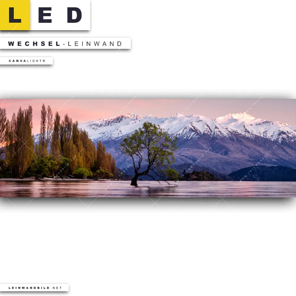 Du bist auf der Suche nach einer Landschaften Wechsel-Leinwand für Dein LED-Leinwandbild im Panorama-Format? Begriffe wie Berge, See, Gebirge, Neuseeland, Sonnenaufgang, Morgenstunde, Baum, Schnee haben Dich auf der Suche nach Deiner Ersatz-Leinwand für dein extra breites LED Wandbild mit wechselbarer Leinwand inspiriert? Farben wie Blau, Rosa, Grün, Lila dürfen auf Deinem neuen Wechselmotiv für Dein XXL Leinwand-LED-Bild nicht fehlen und Leinwände im Natürlich - Realistisch Stil für Leuchtbilder passen perfekt zu Deinem Einrichtungsstil?