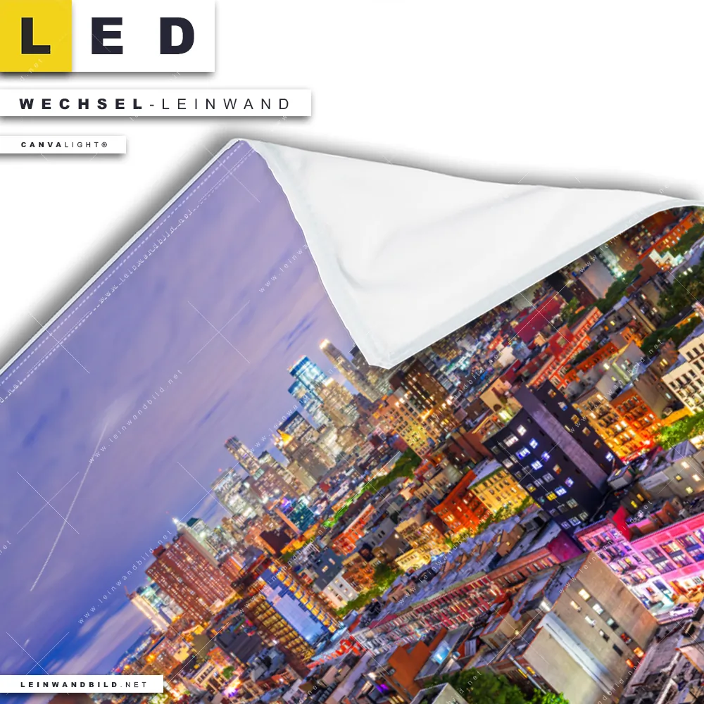 Du bist auf der Suche nach einer Architektur - Gebäude, Städte - Skylines Wechsel-Leinwand für Dein LED-Leinwandbild im Querformat? Begriffe wie Skyline, Amerika, New York, Abendhimmel, Stadtpanorama, Metropole, Nachtlichter haben Dich auf der Suche nach Deiner Ersatz-Leinwand für dein breites LED Wandbild mit wechselbarer Leinwand inspiriert? Farben wie Bunt dürfen auf Deinem neuen Wechselmotiv für Dein XXL Leinwand-LED-Bild nicht fehlen und Leinwände im Natürlich - Realistisch Stil für Leuchtbilder passen perfekt zu Deinem Einrichtungsstil?