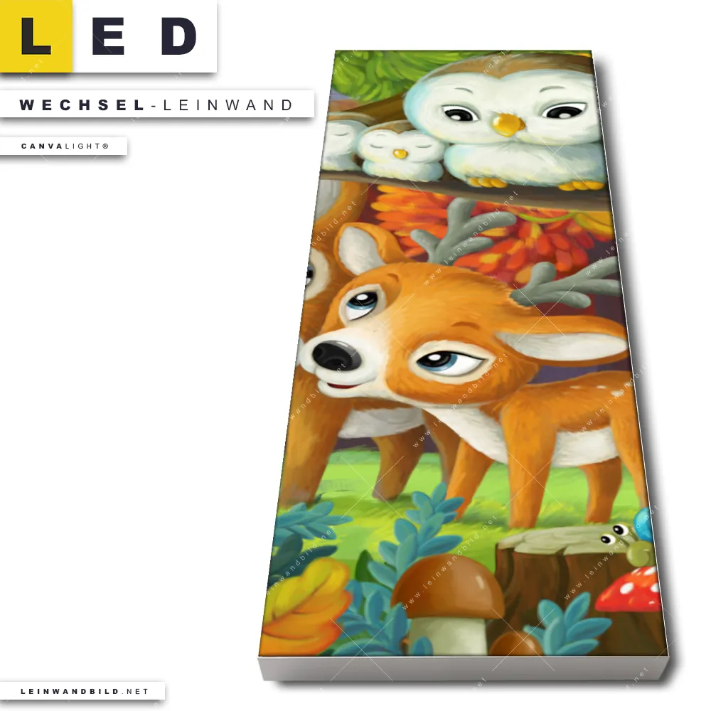 Dann sollte die Wechsel-Leinwand Canvalight® TEX | Niedliche Waldtiere | Schmal den Weg zu Dir finden. Die Austausch-Leinwand Tiere spielen gemeinsam - passend für unsere stufenlos dimmbaren, steckerfertigen Leinwandbilder im LED Leuchtrahmen mit Fernbedienung und optionaler Farbtemperatursteuerung - fügt sich als Eye-Catcher harmonisch in jedes Kinderzimmer, Arzt - Praxis, Friseur - Beauty Raumkonzept ein.