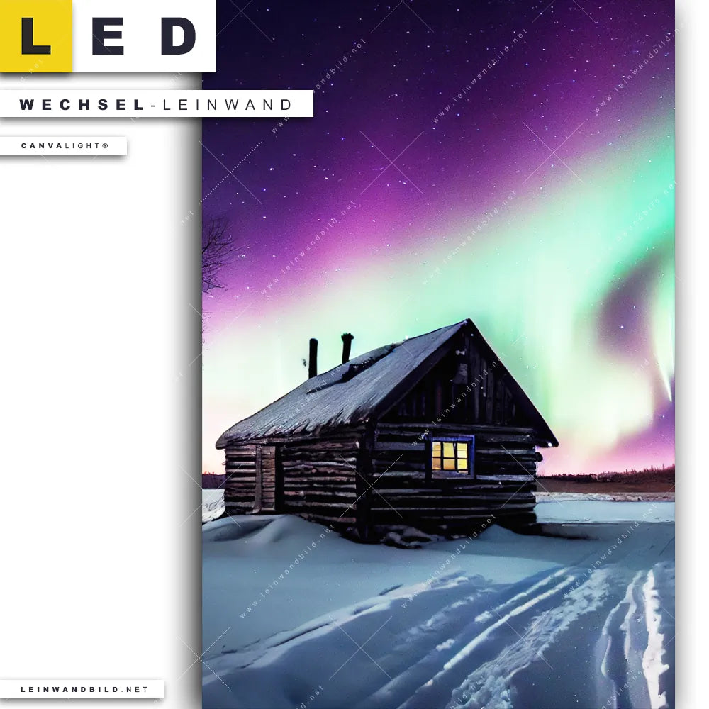 LED Wechsel-Leinwand Canvalight® TEX | Nordlichter über einem Holzhaus | Hochformat