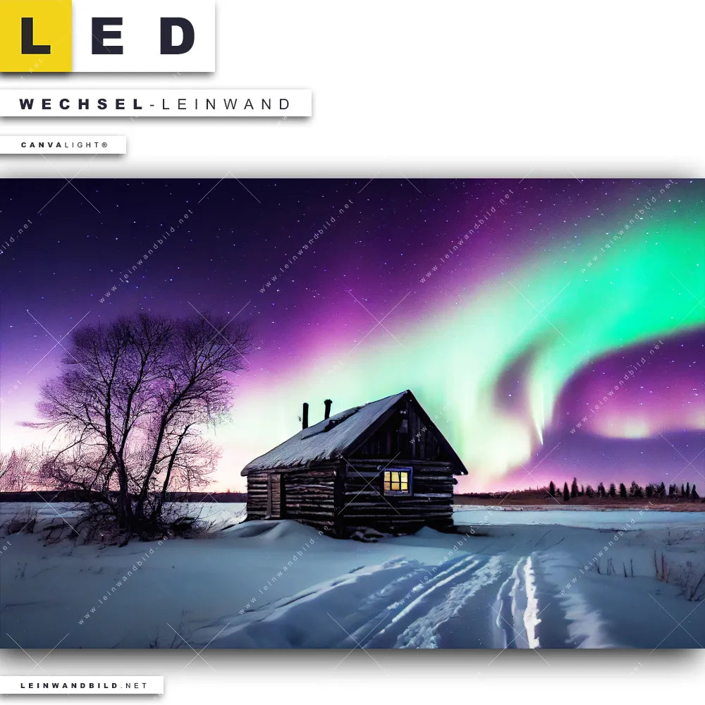 LED Wechsel-Leinwand Canvalight® TEX | Nordlichter über einem Holzhaus | Querformat