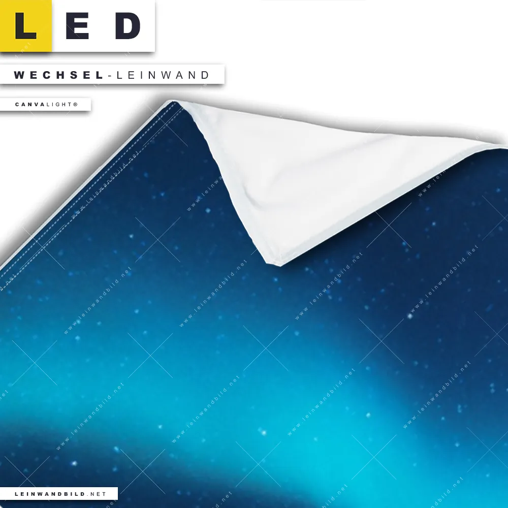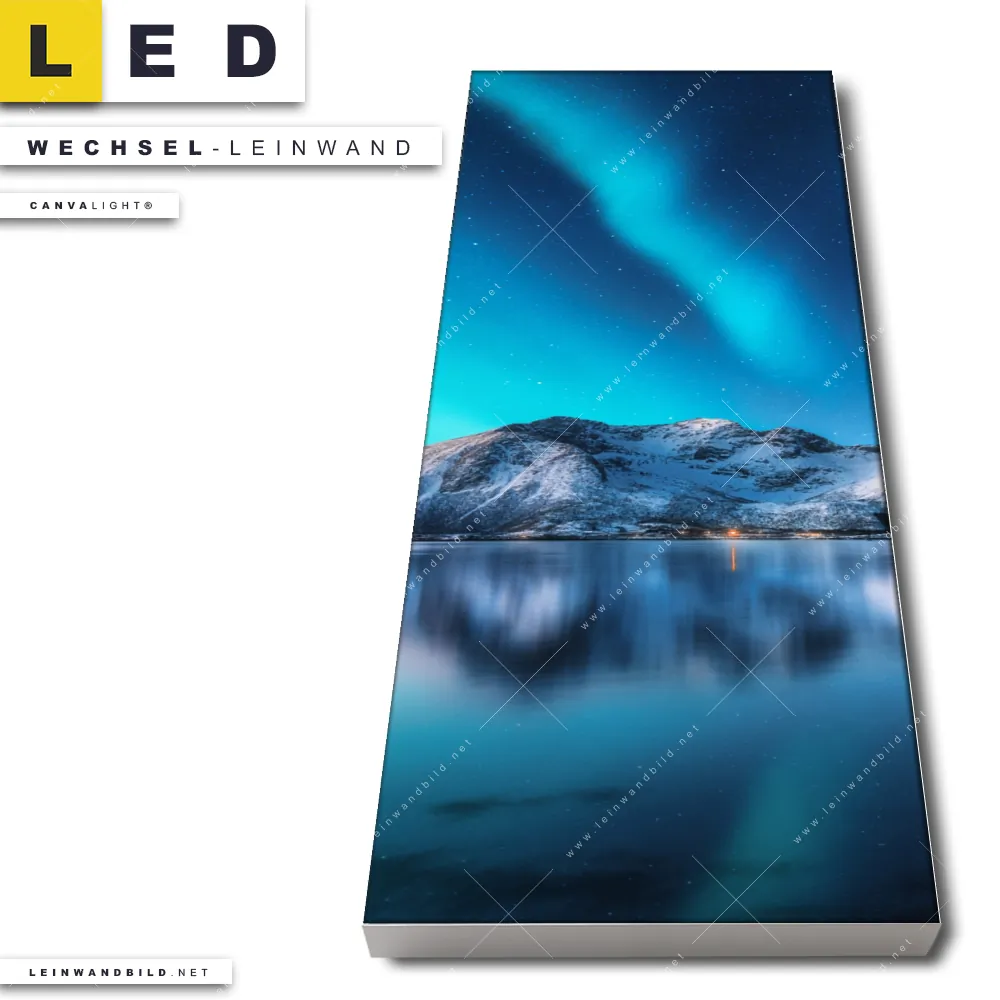 LED Wechsel-Leinwand Canvalight® TEX | Nordlichter und schneebedeckte Berge | Schmal