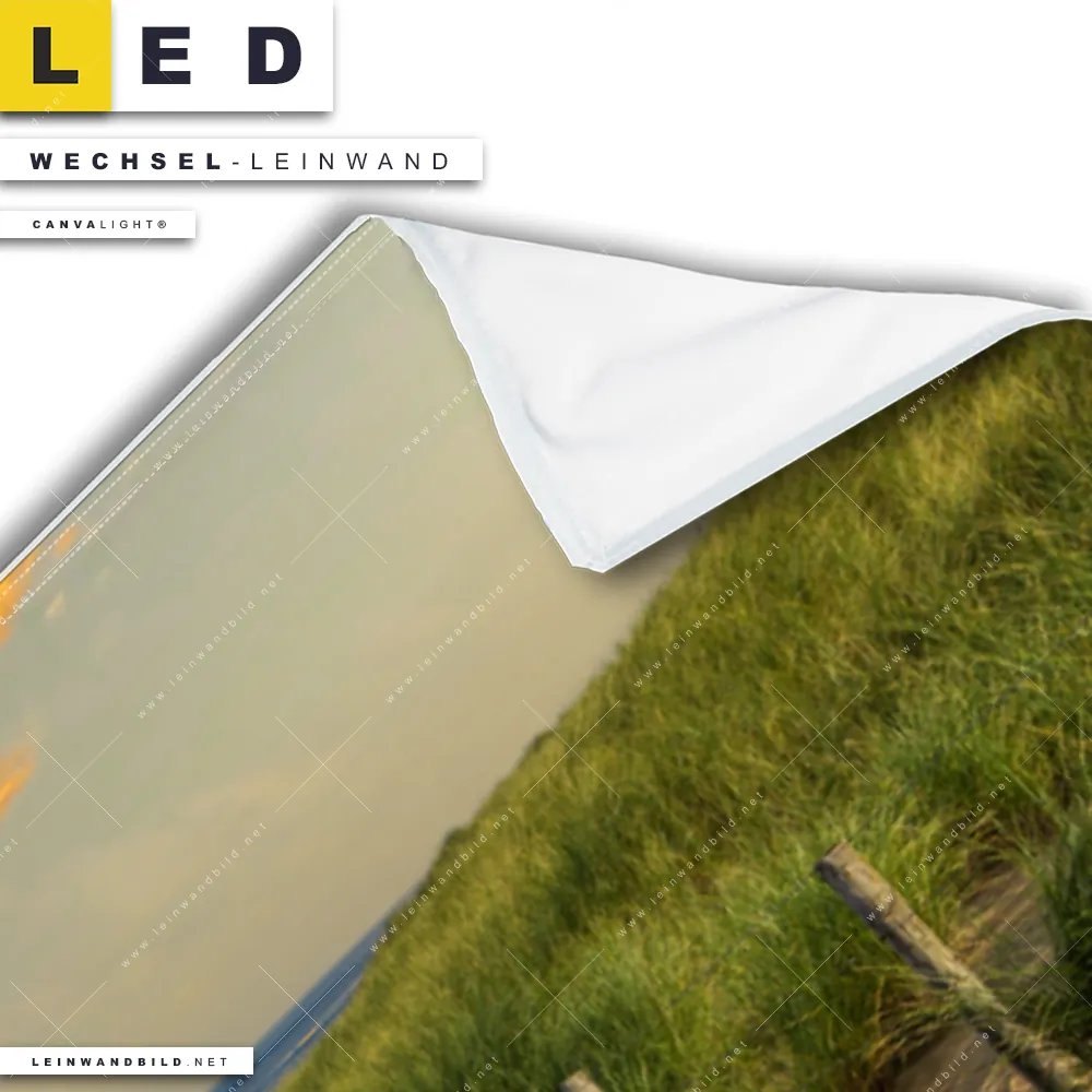 Bitte beachte, dass die Farben, der auf dem Monitor abgebildeten Abendstimmung an der deutschen Küste Darstellung, möglicherweise von den Originalfarben deiner Canvalight® TEX Wechsel-Leinwand abweichen können.