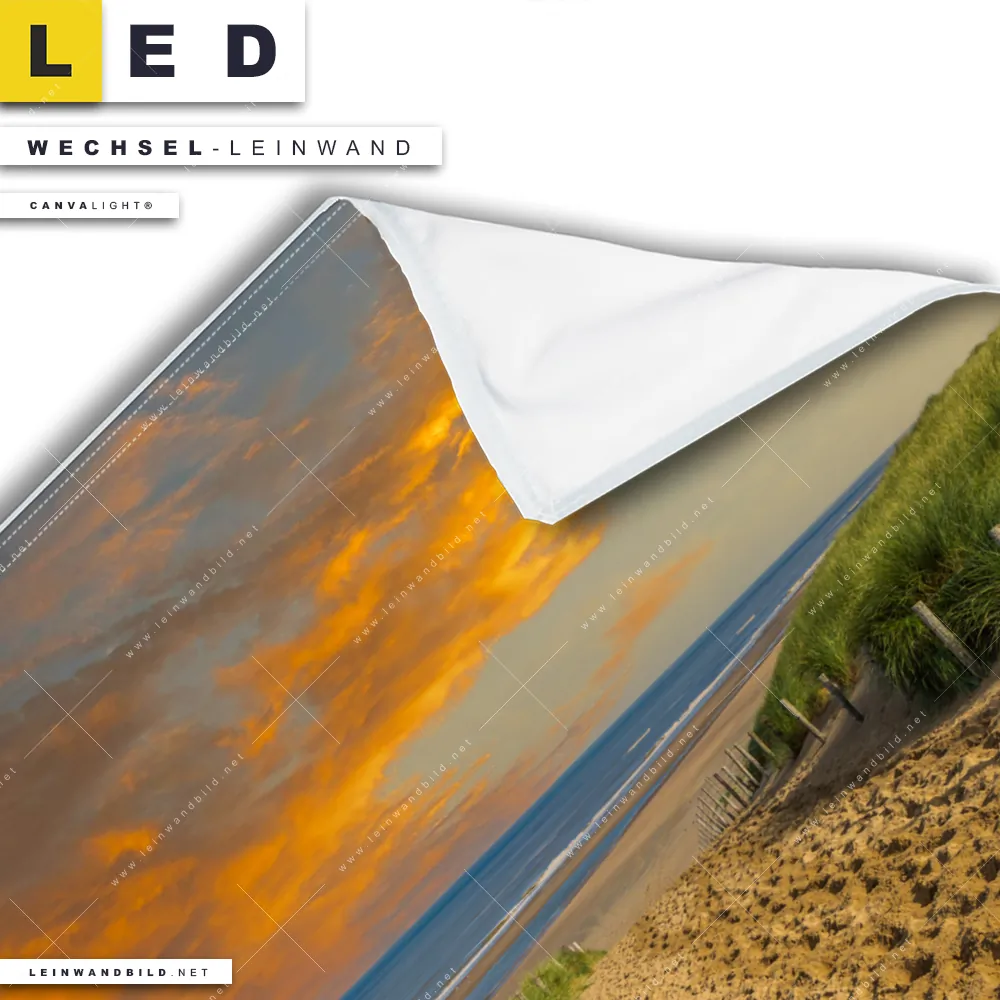 Bitte beachte, dass die Farben, der auf dem Monitor abgebildeten Abendstimmung an der deutschen Küste Darstellung, möglicherweise von den Originalfarben deiner Canvalight® TEX Wechsel-Leinwand abweichen können.