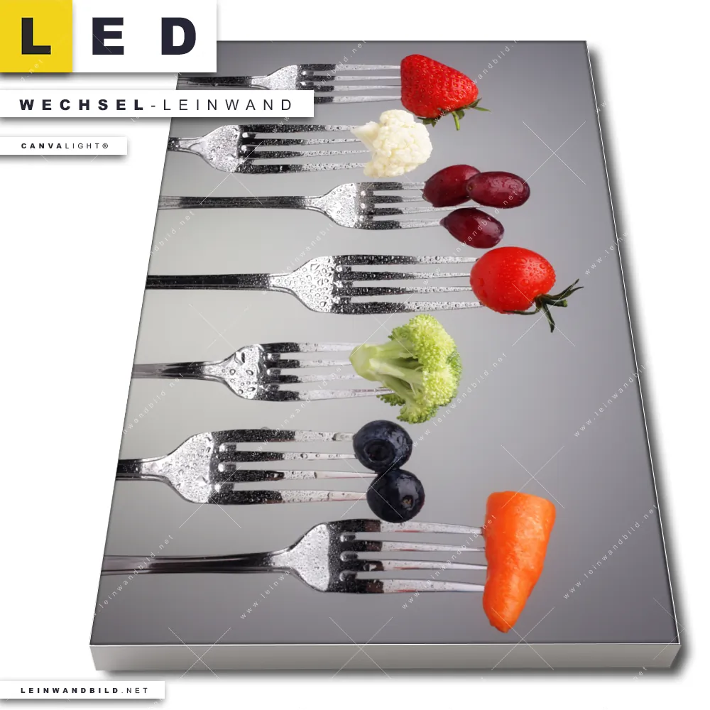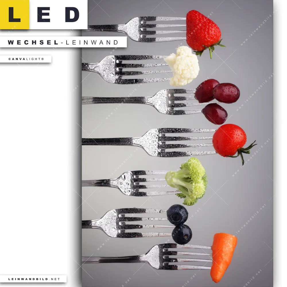 LED Wechsel-Leinwand Canvalight® TEX | Obst & Gemüse auf Gabeln | Hochformat