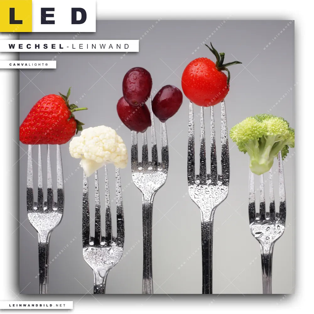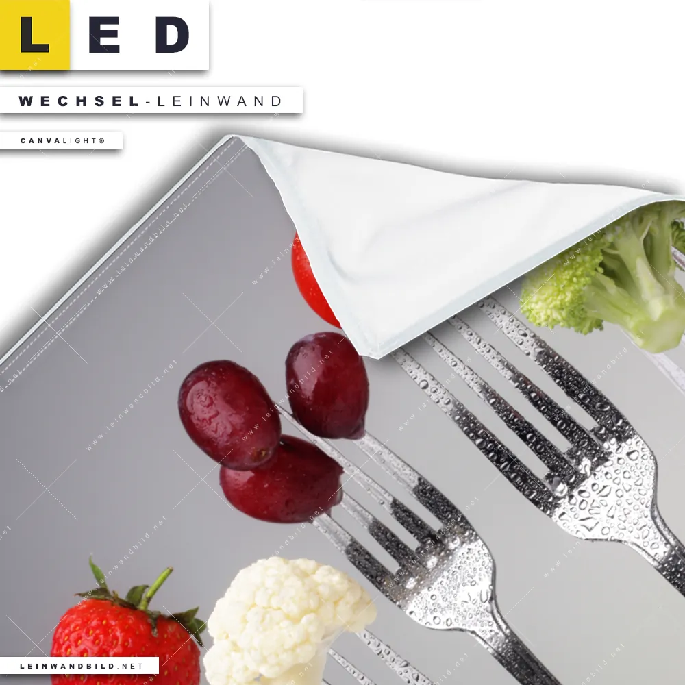 Du konfigurierst Deine individuelle LED Wechsel-Leinwand Canvalight® TEX | Obst & Gemüse auf Gabeln | Quadrat und wir produzieren sie NEU für Dich. Unsere Essen - Trinken Austausch-Fotoleinwände für Canvalight® LED Bilder sind KEINE Lagerware. Du bist Dir unsicher, welches Motiv oder Format das richtige für dein individuelles LED Wechselmotiv auf Leinwand ist, dann helfen wir dir gerne weiter und beraten dich!