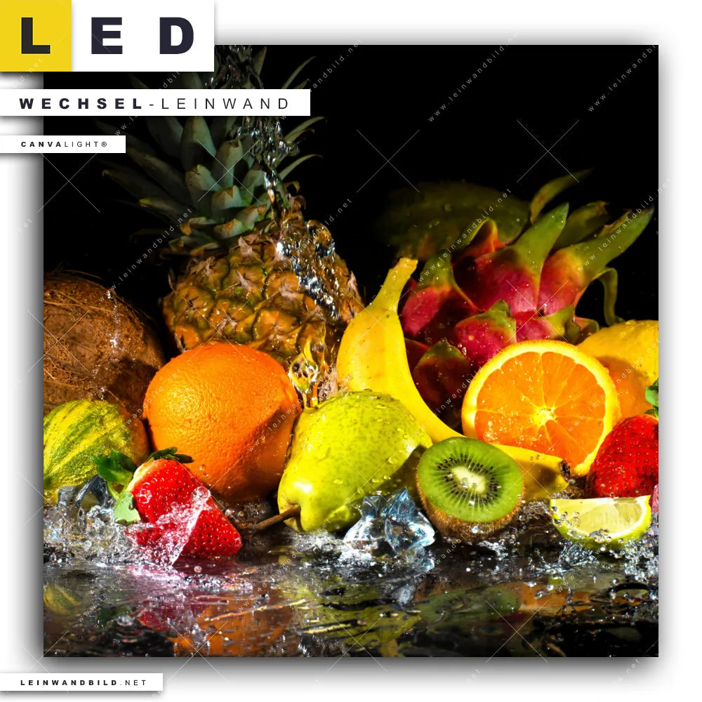 Du bist auf der Suche nach einer Essen - Trinken Wechsel-Leinwand für Dein LED-Leinwandbild im Quadratischen Format? Begriffe wie Obst, Zitrusfrüchte, Früchte, Kiwi, frisch, spritzig, Ananas, Spritzwasser, Wasser, Spritzer, Tropfen, Wassertropfen, Orange, Apfel, Zitrone, Birne, Banane haben Dich auf der Suche nach Deiner Ersatz-Leinwand für dein LED Wandbild mit wechselbarer Leinwand inspiriert? Farben wie Bunt, Schwarz, Braun, Gelb , Grün, Hellblau, Lila, Orange, Rot dürfen auf Deinem neuen Wechselmotiv für Dein XXL Leinwand-LED-Bild nicht fehlen und Leinwände im Mixed Media, Modern Art Stil für Leuchtbilder passen perfekt zu Deinem Einrichtungsstil?