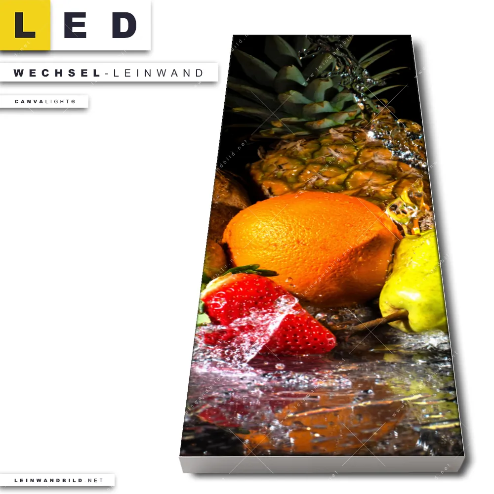 Dann sollte die Wechsel-Leinwand Canvalight® TEX | Obst-in spritzendem Wasser | Schmal den Weg zu Dir finden. Die Austausch-Leinwand frisches Obst mit Wasserspritzern - passend für unsere stufenlos dimmbaren, steckerfertigen Leinwandbilder im LED Leuchtrahmen mit Fernbedienung und optionaler Farbtemperatursteuerung - fügt sich als Eye-Catcher harmonisch in jedes Bar - Gastronomie, Küche - Esszimmer Raumkonzept ein.