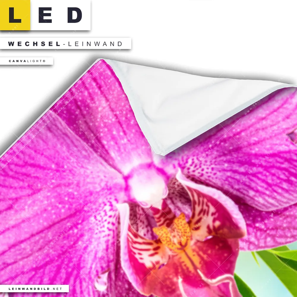 Du konfigurierst Deine individuelle LED Wechsel-Leinwand Canvalight® TEX | Orchidee & Wassertropfen | Panorama und wir produzieren sie NEU für Dich. Unsere Buddha - Feng Shui, Blumen - Botanik Austausch-Fotoleinwände für Canvalight® LED Bilder sind KEINE Lagerware. Du bist Dir unsicher, welches Motiv oder Format das richtige für dein individuelles LED Wechselmotiv auf Leinwand ist, dann helfen wir dir gerne weiter und beraten dich!