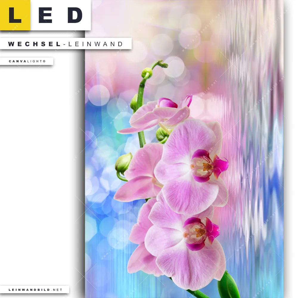 Du bist auf der Suche nach einer Blumen - Botanik Wechsel-Leinwand für Dein LED-Leinwandbild im Hochformat? Begriffe wie Blume, Blüte, Pflanze, Tropfen, Orchidee, Wasser, Spiegelung, Wasserspiegelung haben Dich auf der Suche nach Deiner Ersatz-Leinwand für dein LED Wandbild mit wechselbarer Leinwand inspiriert? Farben wie Hellblau, Rosa, Pink, Blau dürfen auf Deinem neuen Wechselmotiv für Dein XXL Leinwand-LED-Bild nicht fehlen und Leinwände im Floral, Mixed Media Stil für Leuchtbilder passen perfekt zu Deinem Einrichtungsstil?