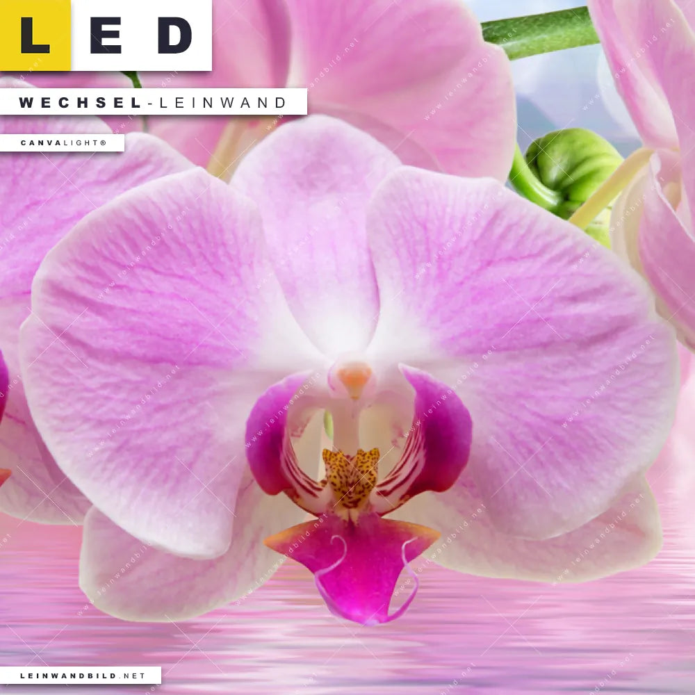 Dann sollte die Wechsel-Leinwand Canvalight® TEX | Orchideen Blüten | Hochformat den Weg zu Dir finden. Die Austausch-Leinwand rosa-blaues Farbspiel zwischen Wasser und Blüte - passend für unsere stufenlos dimmbaren, steckerfertigen Leinwandbilder im Leuchtrahmen mit Fernbedienung und optionaler Farbtemperatursteuerung - fügt sich als Eye-Catcher harmonisch in jedes Arzt - Praxis, Wohnzimmer - Schlafzimmer, Badezimmer Raumkonzept ein.