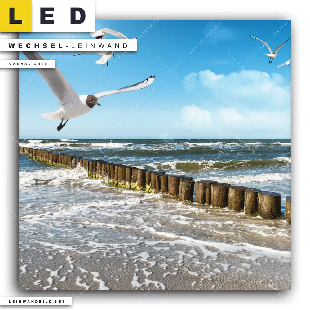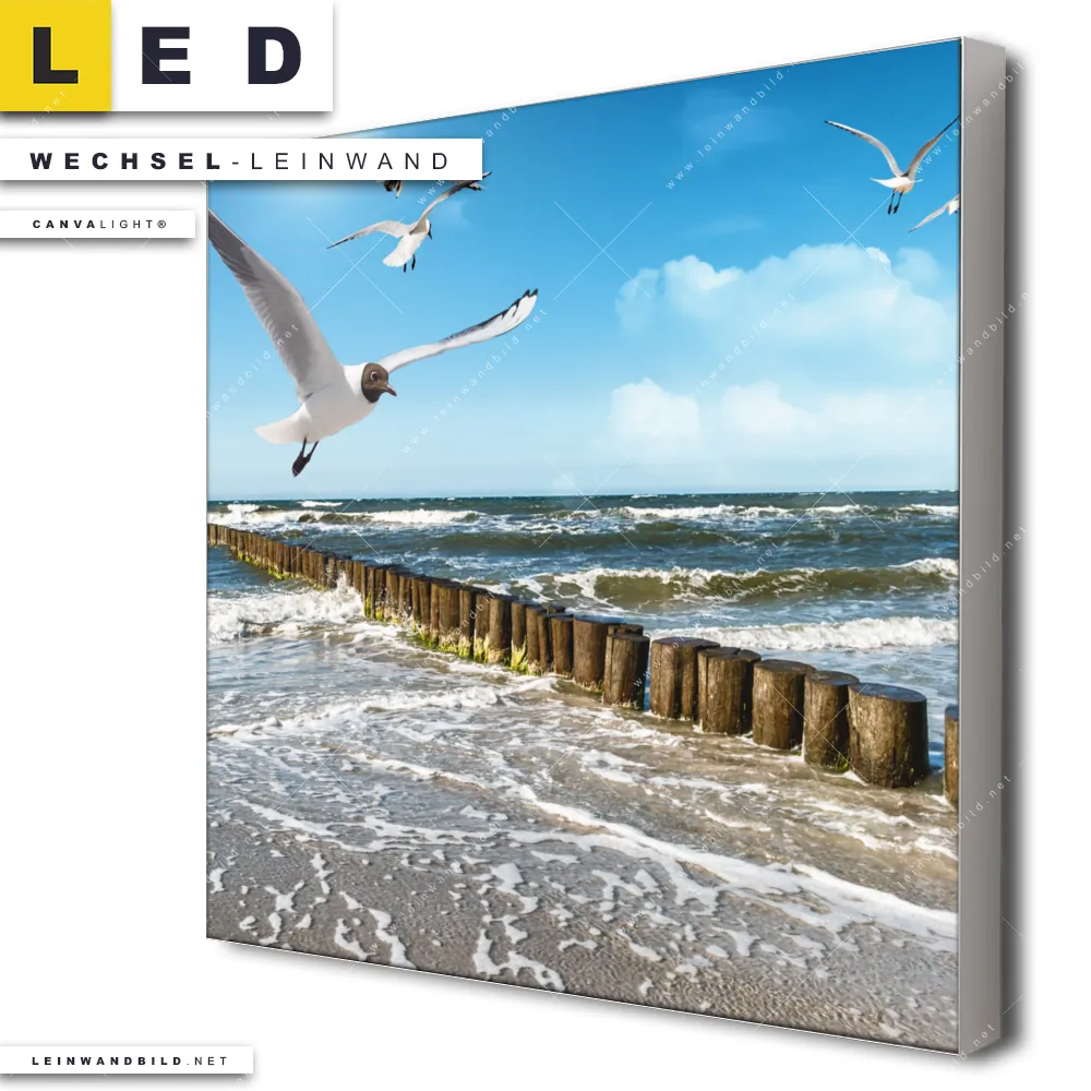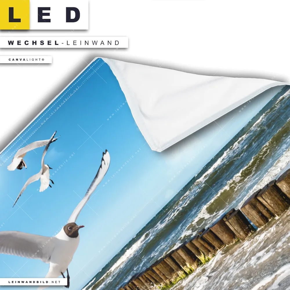Du bist auf der Suche nach einer Strand - Meer, Landschaften Wechsel-Leinwand für Dein LED-Leinwandbild im Quadratischen Format? Begriffe wie Möwe, Deutschland, Frühling, Vogel, Ostsee - Nordsee, Urlaub - Reisen, Sommer, Wellenbrecher, Buhnen, Wellen - Surfen haben Dich auf der Suche nach Deiner Ersatz-Leinwand für dein LED Wandbild mit wechselbarer Leinwand inspiriert? Farben wie Orange, Blau, Weiss, Hellblau dürfen auf Deinem neuen Wechselmotiv für Dein XXL Leinwand-LED-Bild nicht fehlen und Leinwände im Natürlich - Realistisch Stil für Leuchtbilder passen perfekt zu Deinem Einrichtungsstil?