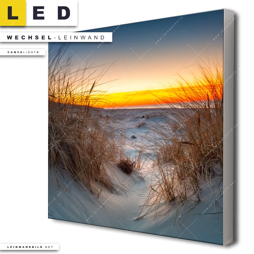 Du bist auf der Suche nach einer Landschaften, Strand - Meer Wechsel-Leinwand für Dein LED-Leinwandbild im Quadratischen Format? Begriffe wie Deutschland, Herbst, Sommer, Urlaub - Reisen, Ostsee - Nordsee, Sonnenuntergang - Sonnenaufgang, Frühling, Sand, Dünen, Gräser haben Dich auf der Suche nach Deiner Ersatz-Leinwand für dein LED Wandbild mit wechselbarer Leinwand inspiriert? Farben wie Beige, Orange, Blau dürfen auf Deinem neuen Wechselmotiv für Dein XXL Leinwand-LED-Bild nicht fehlen und Leinwände im Natürlich - Realistisch Stil für Leuchtbilder passen perfekt zu Deinem Einrichtungsstil?