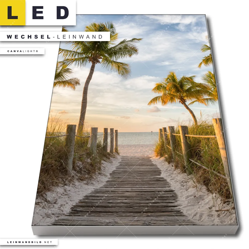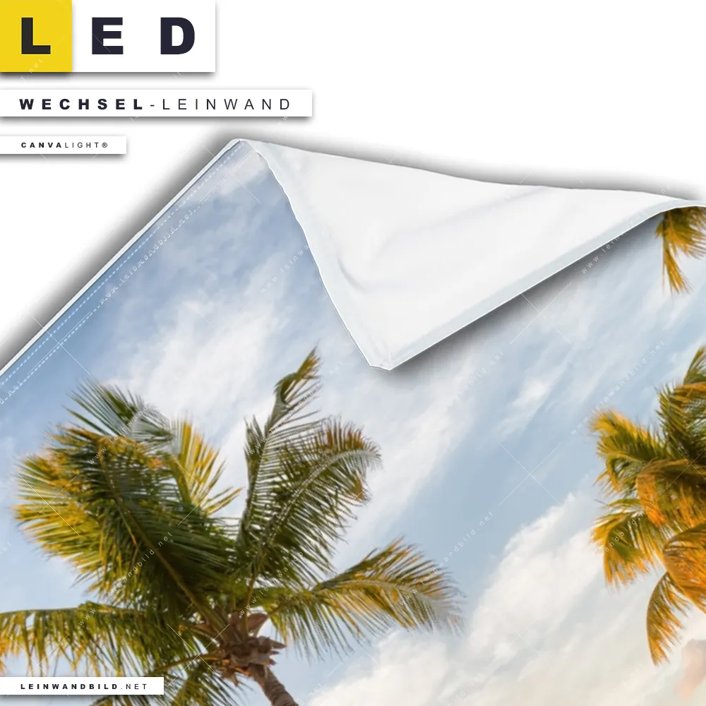 LED Wechsel-Leinwand Canvalight® TEX | Palmen am Strandweg | Hochformat