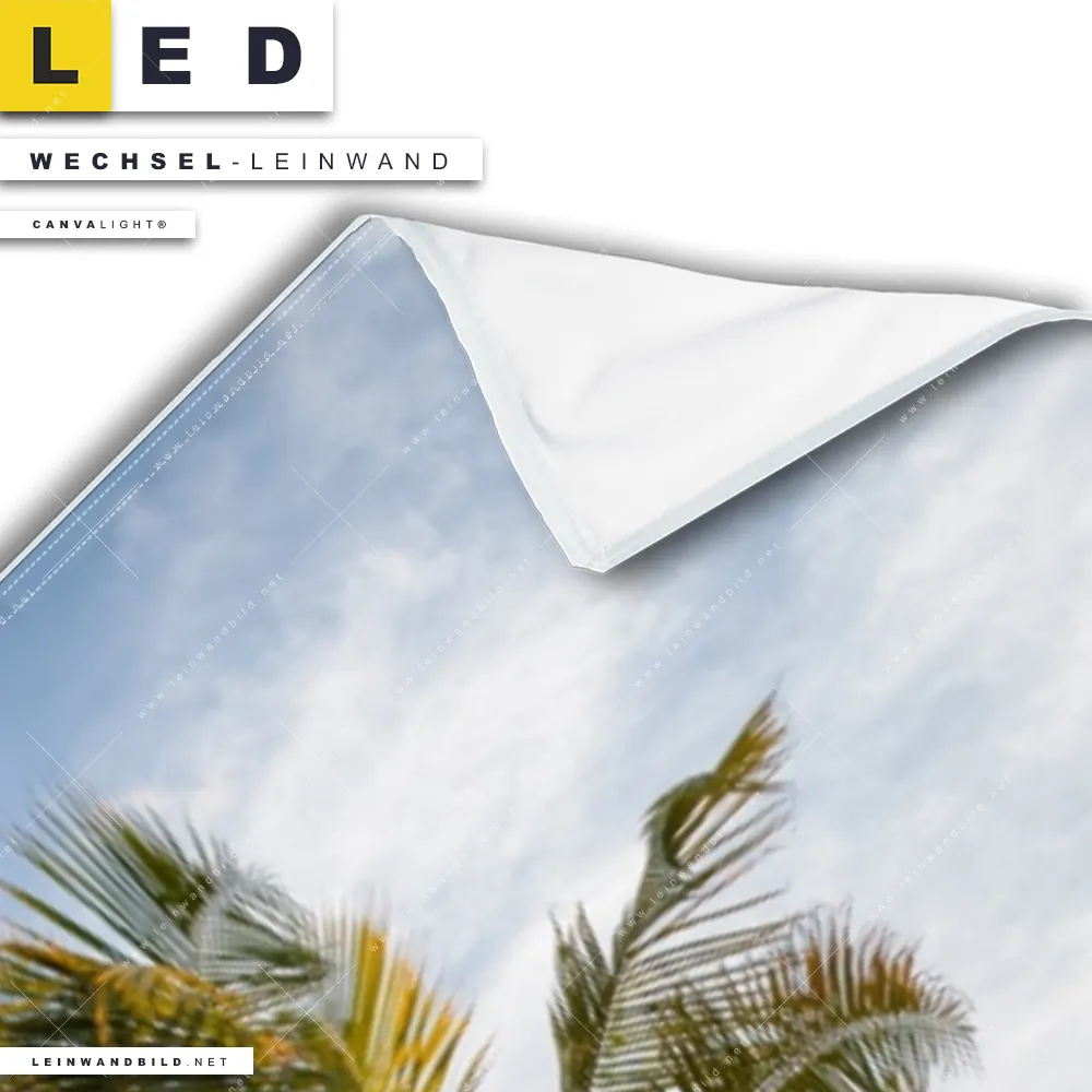 Bitte beachte, dass die Farben, der auf dem Monitor abgebildeten Strand mit Palmen Darstellung, möglicherweise von den Originalfarben deiner Canvalight® TEX Wechsel-Leinwand abweichen können.