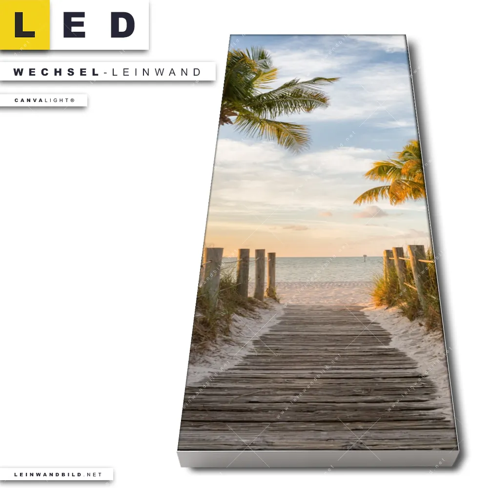 Du bist auf der Suche nach einer Landschaften, Strand - Meer Wechsel-Leinwand für Dein LED-Leinwandbild im Schmalen Format? Begriffe wie Strand, Sand, Steg, Weg, Palmen, Südsee - Karibik, Urlaub - Reisen, Sonnenuntergang - Sonnenaufgang haben Dich auf der Suche nach Deiner Ersatz-Leinwand für dein LED Wandbild im Panorama-Hochformat mit wechselbarer Leinwand inspiriert? Farben wie Beige, Blau, Grün dürfen auf Deinem neuen Wechselmotiv für Dein XXL Leinwand-LED-Bild nicht fehlen und Leinwände im Natürlich - Realistisch Stil für Leuchtbilder passen perfekt zu Deinem Einrichtungsstil?