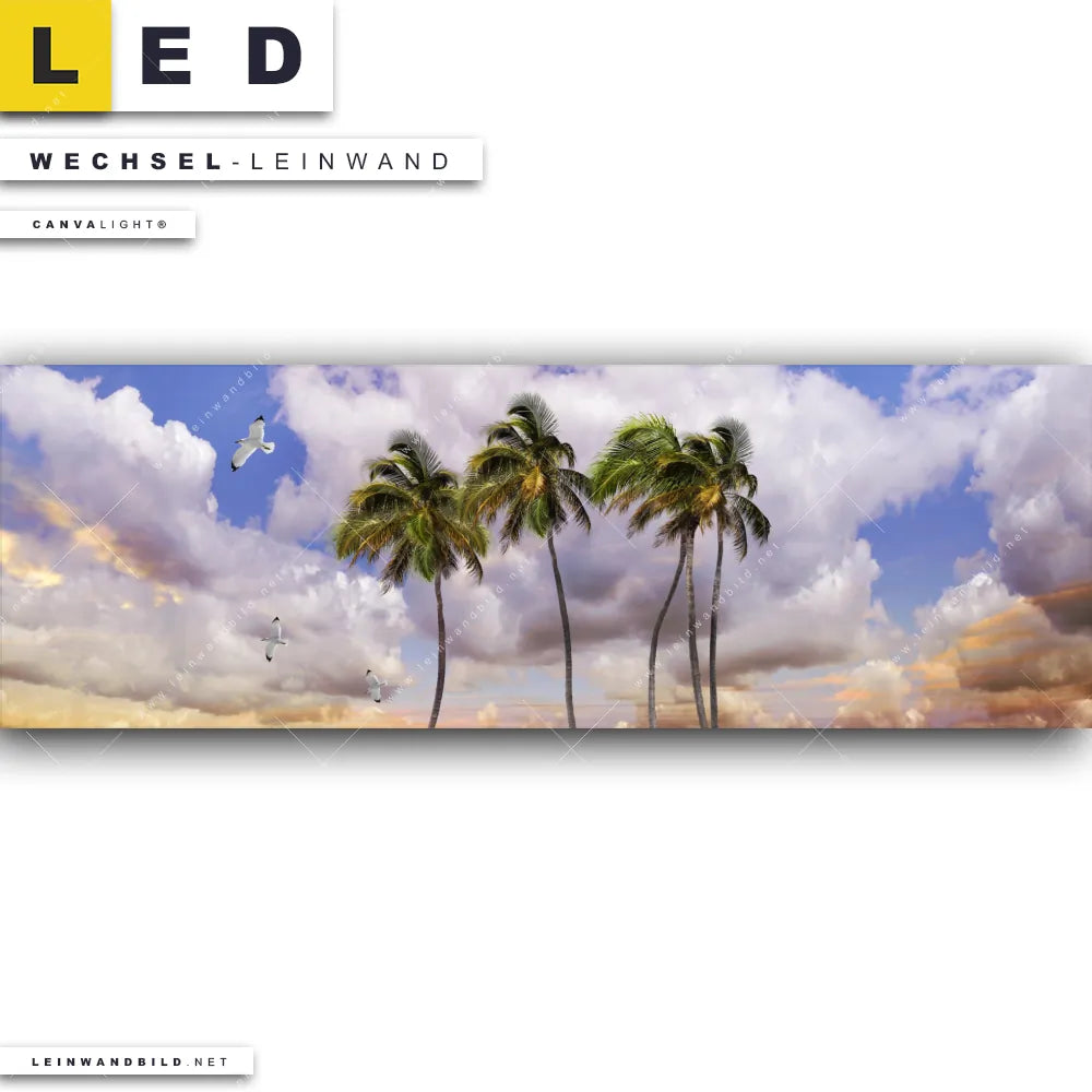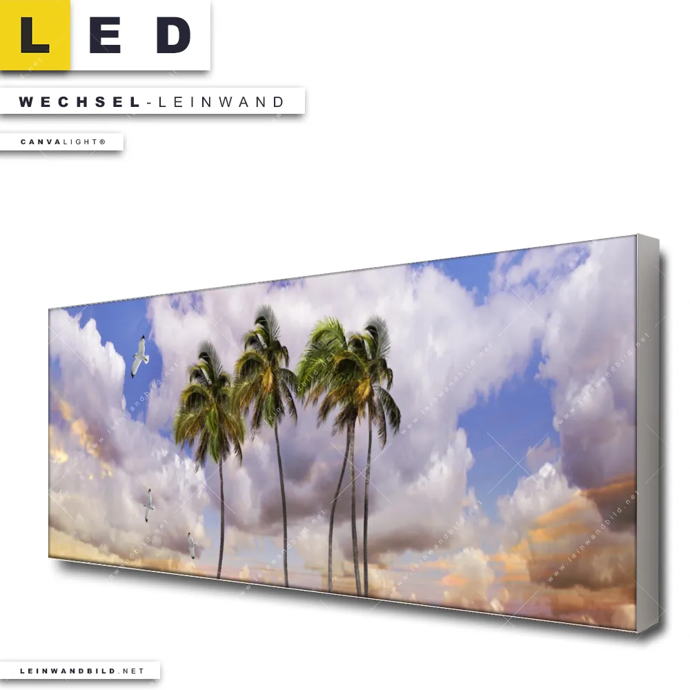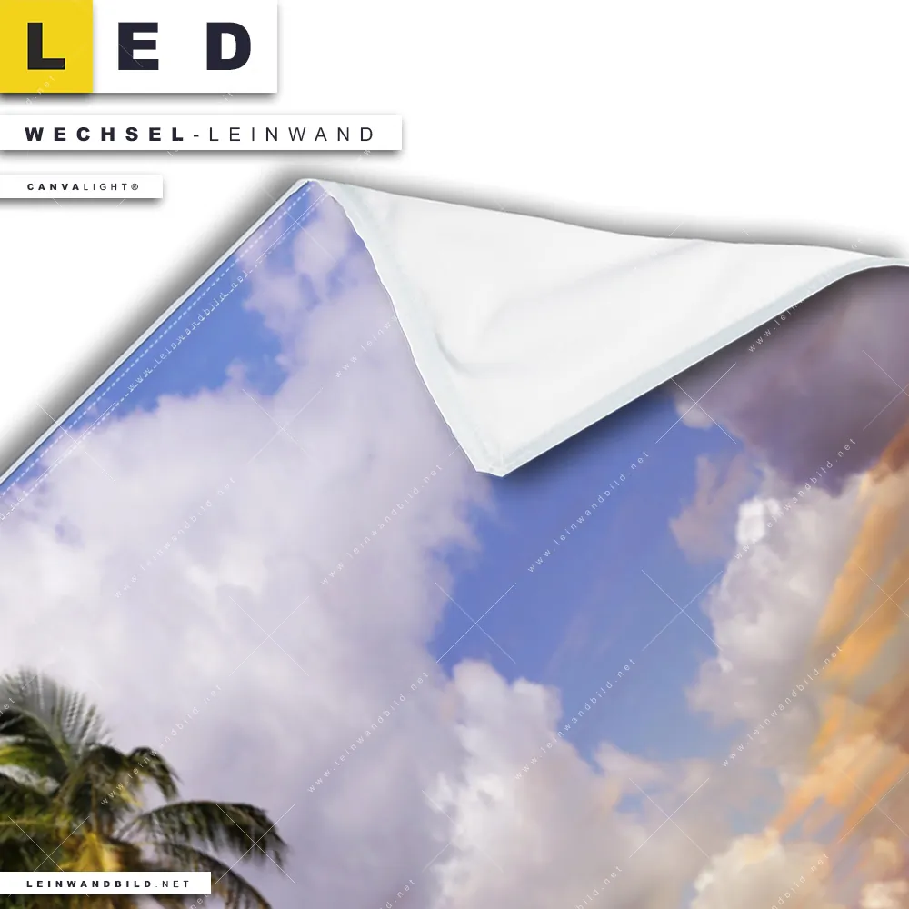 Dann sollte die Wechsel-Leinwand Canvalight® TEX | Palmen auf Insel | Panorama den Weg zu Dir finden. Die Austausch-Leinwand Palmen bei Sonnenuntergang - passend für unsere stufenlos dimmbaren, steckerfertigen Leinwandbilder im LED Leuchtrahmen mit Fernbedienung und optionaler Farbtemperatursteuerung - fügt sich als Eye-Catcher harmonisch in jedes Arzt - Praxis, Wohnzimmer - Schlafzimmer, Badezimmer Raumkonzept ein.