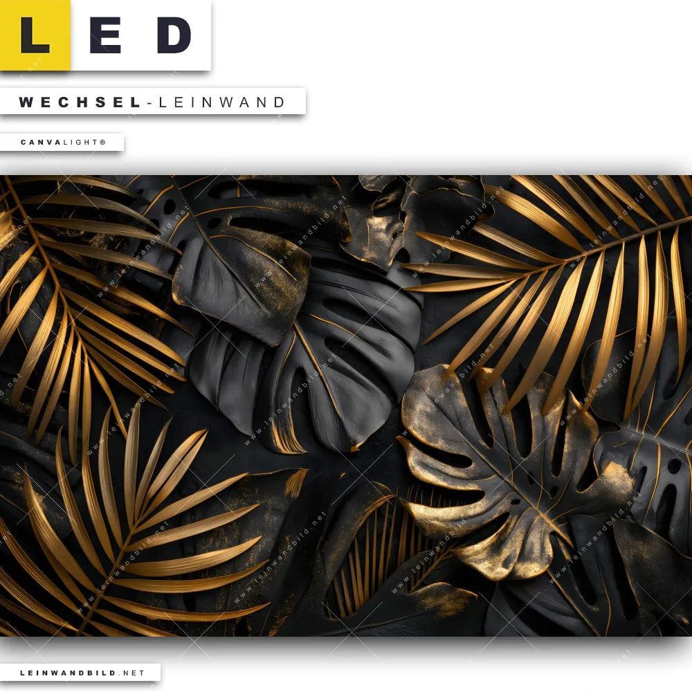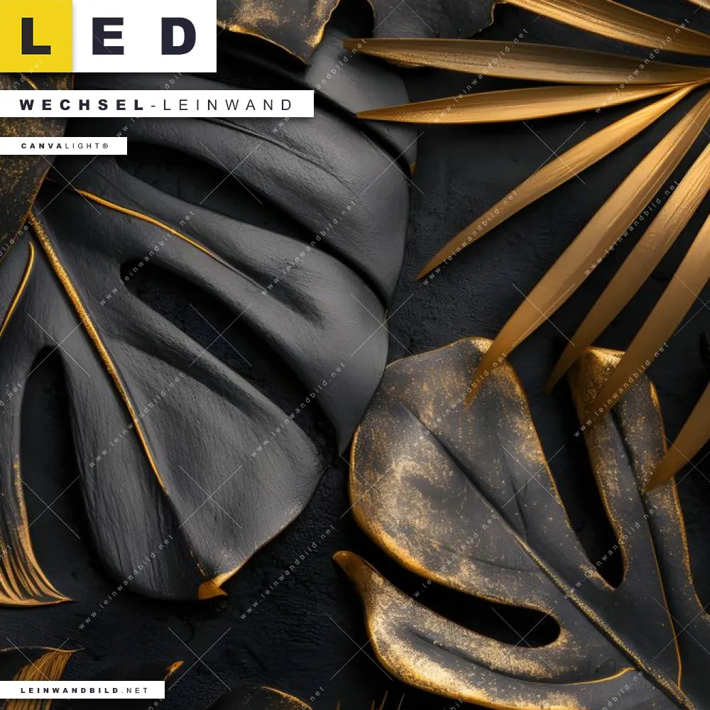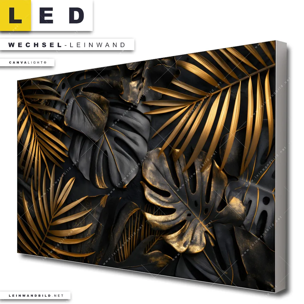 LED Wechsel-Leinwand Canvalight® TEX | Palmenblätter Schwarz Gold | Querformat