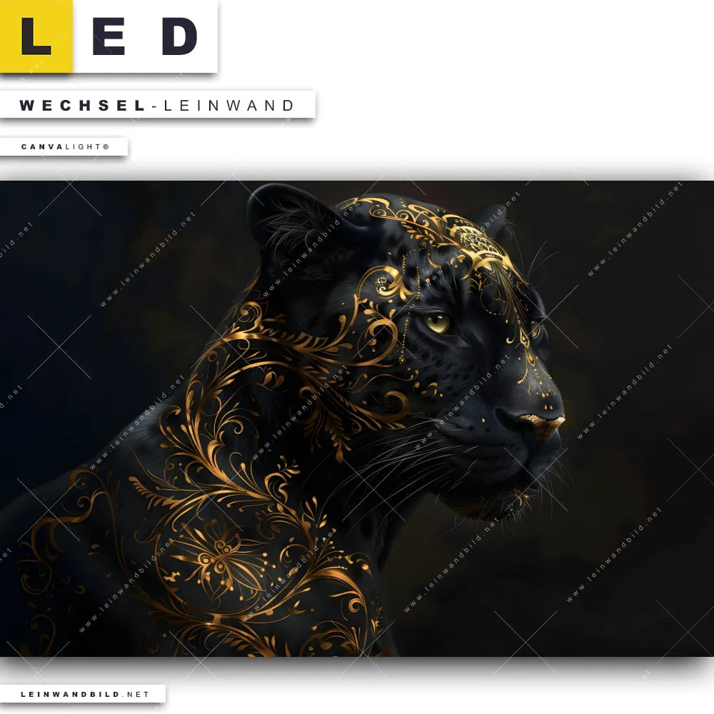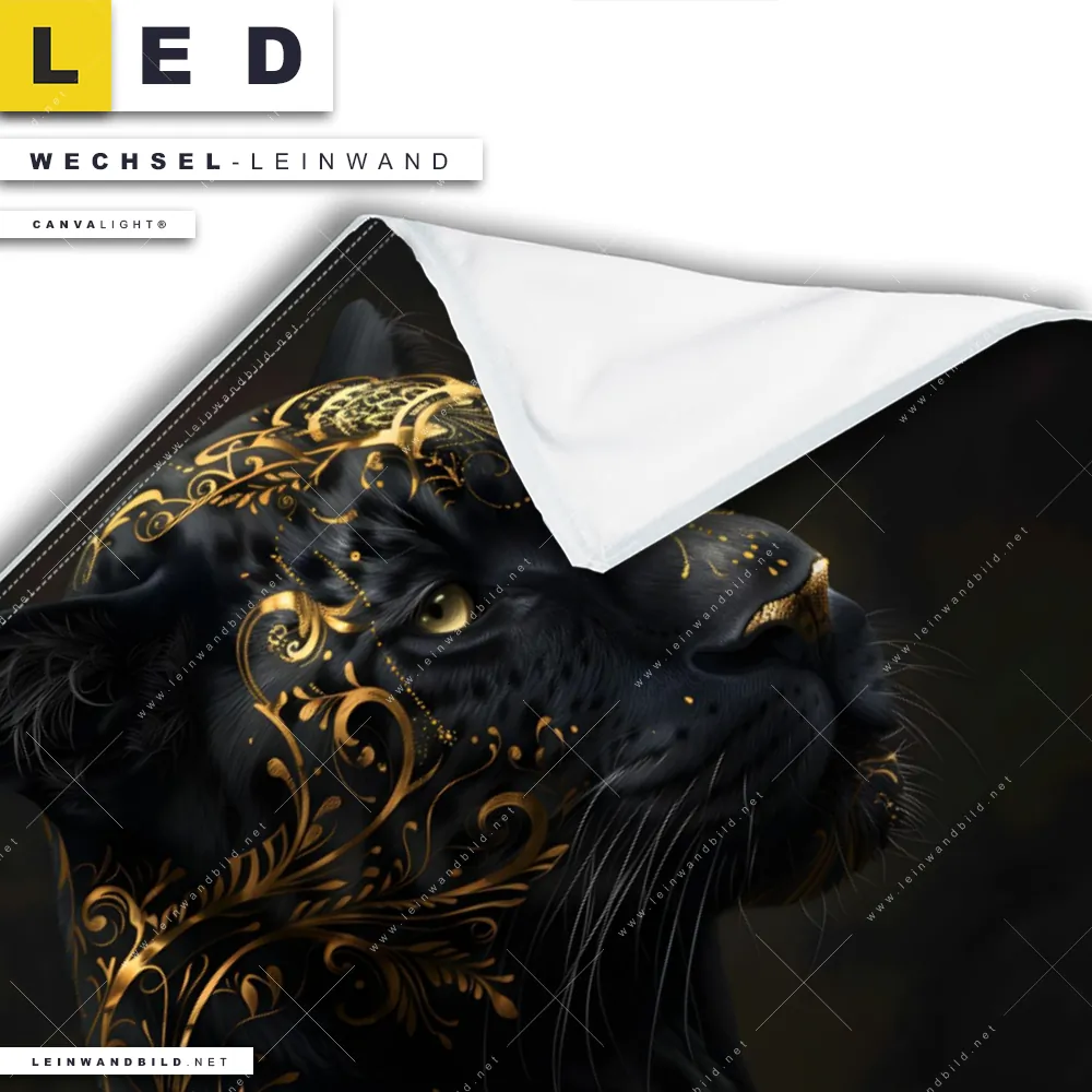 LED Wechsel-Leinwand Canvalight® TEX | Panther mit goldenen Ornamenten | Querformat
