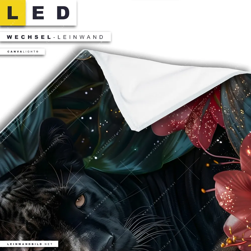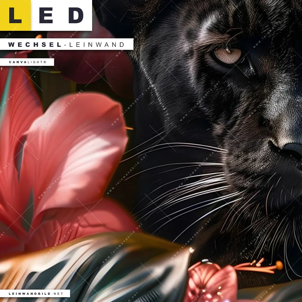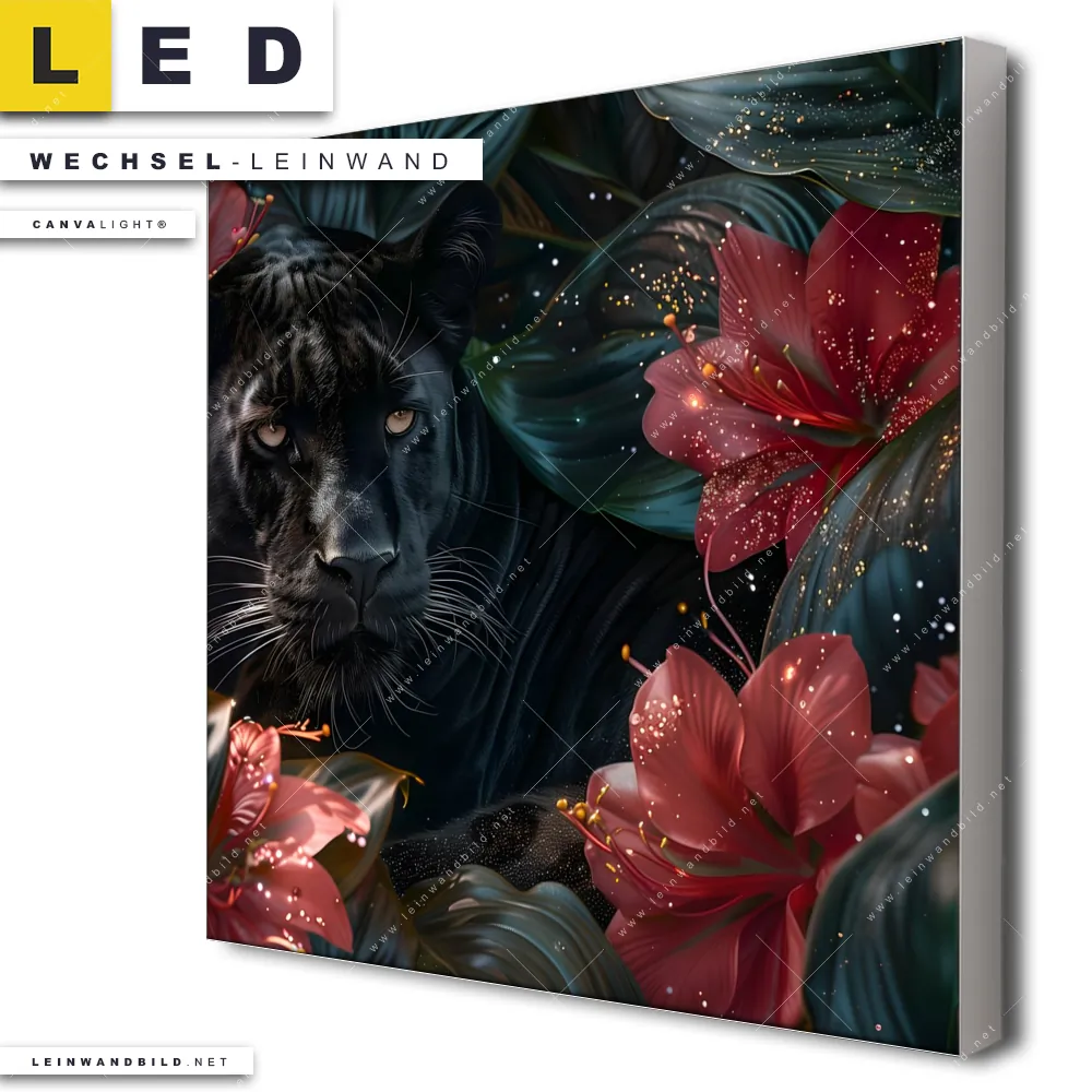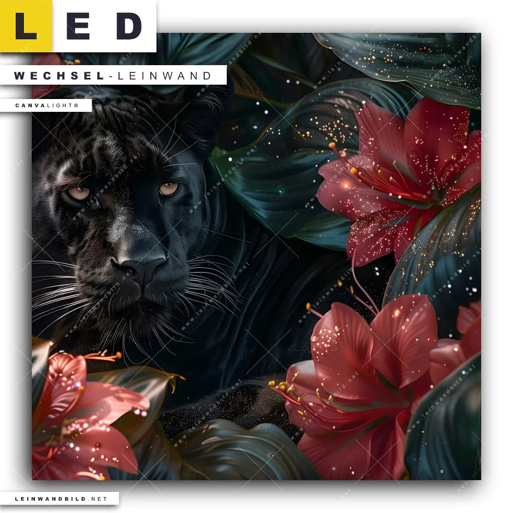 Du bist auf der Suche nach einer Tierwelt, Blumen - Botanik Wechsel-Leinwand für Dein LED-Leinwandbild im Quadratischen Format? Begriffe wie Blätter, Natur, Nahaufnahme, Dschungel, Panther, Raubkatze, Blumen, Blüten haben Dich auf der Suche nach Deiner Ersatz-Leinwand für dein LED Wandbild mit wechselbarer Leinwand inspiriert? Farben wie Schwarz, Grün, Rot dürfen auf Deinem neuen Wechselmotiv für Dein XXL Leinwand-LED-Bild nicht fehlen und Leinwände im Floral, Modern Art Stil für Leuchtbilder passen perfekt zu Deinem Einrichtungsstil?