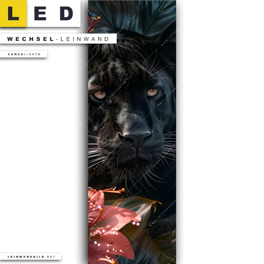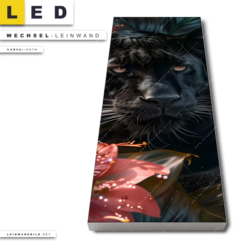 Du bist auf der Suche nach einer Tierwelt, Blumen - Botanik Wechsel-Leinwand für Dein LED-Leinwandbild im Schmalen Format? Begriffe wie Blätter, Natur, Nahaufnahme, Dschungel, Panther, Raubkatze, Blumen, Blüten haben Dich auf der Suche nach Deiner Ersatz-Leinwand für dein LED Wandbild im Panorama-Hochformat mit wechselbarer Leinwand inspiriert? Farben wie Schwarz, Grün, Rot dürfen auf Deinem neuen Wechselmotiv für Dein XXL Leinwand-LED-Bild nicht fehlen und Leinwände im Floral, Modern Art Stil für Leuchtbilder passen perfekt zu Deinem Einrichtungsstil?