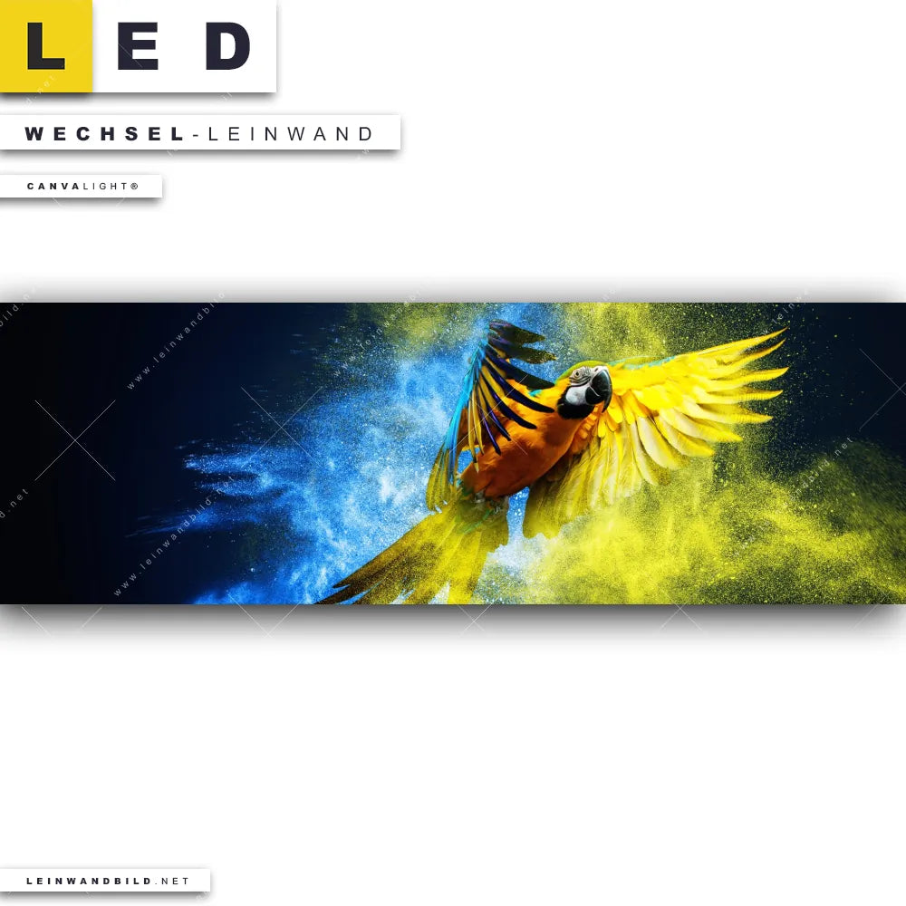 Du bist auf der Suche nach einer Tierwelt Wechsel-Leinwand für Dein LED-Leinwandbild im Panorama-Format? Begriffe wie Vogel, Papagei, Dschungel, Farbe, Farbexplosion, Holi, Farbpulver, Pulver haben Dich auf der Suche nach Deiner Ersatz-Leinwand für dein extra breites LED Wandbild mit wechselbarer Leinwand inspiriert? Farben wie Blau, Schwarz dürfen auf Deinem neuen Wechselmotiv für Dein XXL Leinwand-LED-Bild nicht fehlen und Leinwände im Natürlich - Realistisch, Modern Art Stil für Leuchtbilder passen perfekt zu Deinem Einrichtungsstil?